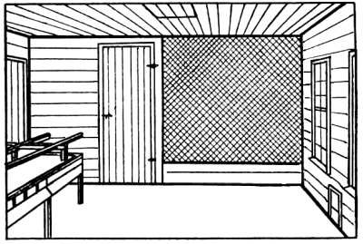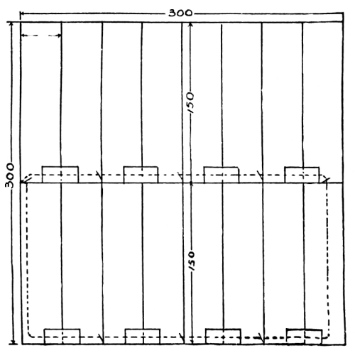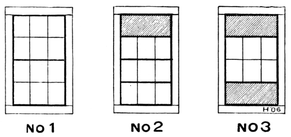 Much of the dampness in poultry houses in winter is due to the condensation of the breath of the fowls. The warm air exhaled from the lungs is heavily charged with moisture, and this, coming in contact with the cold roof and walls, is condensed into hoar-frost, which melts and drops to the floor when the house is warmed up by the sun. In recent years considerable success has attended efforts made to prevent this moisture by ventilating the pens through muslin curtains set into the tops of doors, or forming a part of the front wall (see plans of Dr. Bricault’s poultry house, page 12, and of the Maine Experiment Station House, page 18), also by setting the curtains into part of the window spaces. In Fig. 6 is given an illustration of an experiment tried on the Lone Oak Poultry Farm, Reading, Mass., in the winters of 1904-6. Being much annoyed by the moisture which collected on the roof and walls in the night and, melting, dropped to the floor when the sun warmed the roof and walls during the day, frames the size of one fourth of each window were made and common muslin tacked on. To better ascertain the effect of the curtains the windows in house No. 1 were left closed, as formerly; in house No. 2 the top sash was dropped the length of one light and a curtain set into the space; in house No. 3 the windows were dropped from the top and raised from the bottom, curtains being set into both spaces. In house No. 1 the dampness and “chill” remained as before; in house No. 2 there was some improvement; in house No. 3 there was a great improvement, and the temperature, in the coldest days of the winter, was about six degrees warmer in house No. 3 than in house No. 1 where the windows were all kept closed tight. The two curtains, making half the space of each window, were not quite sufficient to dry out the moisture, which had already got well established, but by installing the curtains both top and bottom as soon as the weather dropped below freezing the next fall, they were found to be ample to keep the pens well ventilated and quite dry.