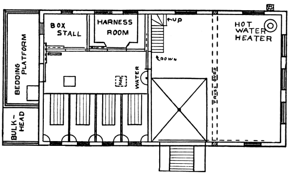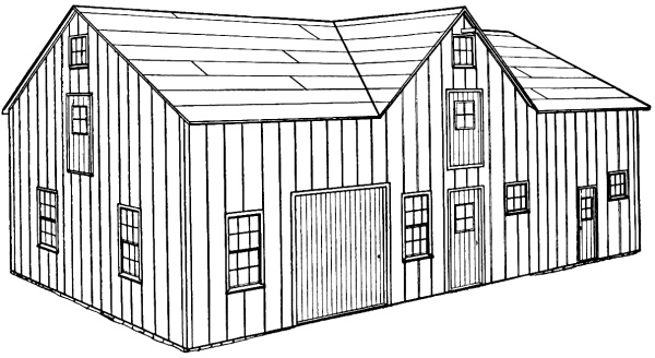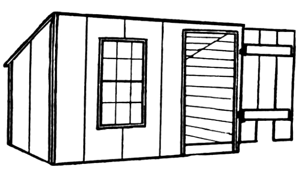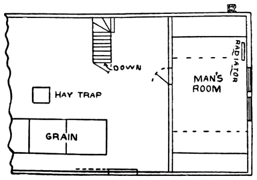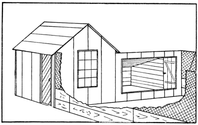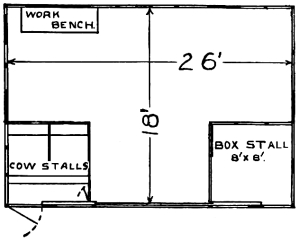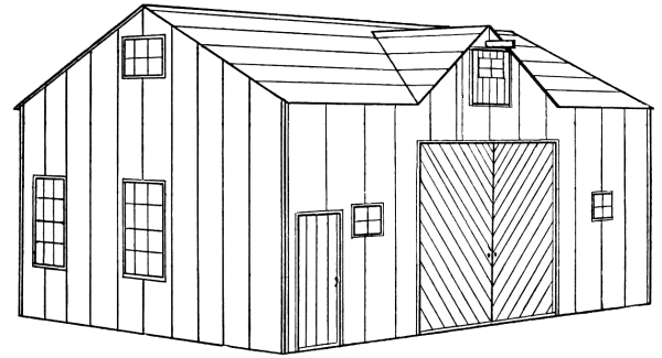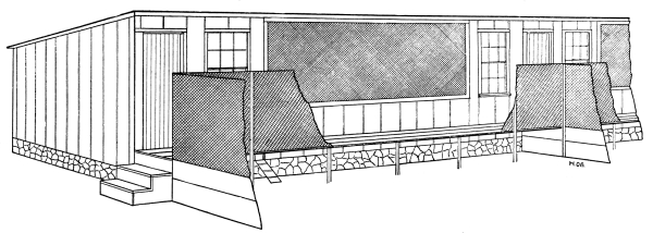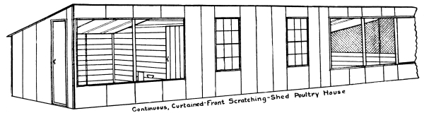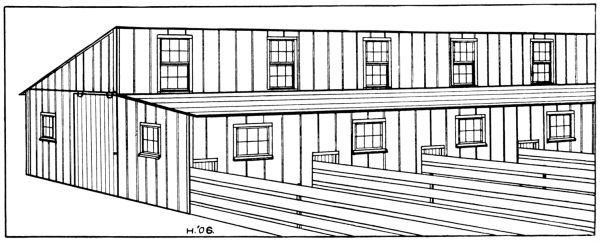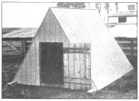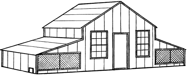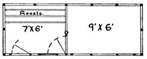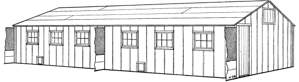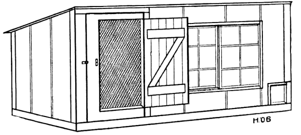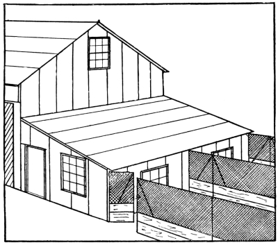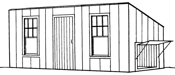 Not infrequently there are small buildings on the place which can be easily and economically adapted to poultry use; as, for example, an old implement house, or grain house, or tool shed, which can be altered into a one or two pen-house, as desired, by arranging windows and doors and adding one or two open-front scratching-sheds for exercise and fresh air (Figs. 7 and 10). In case there is no building suitable for remodelling into a poultry house an inexpensive lean-to may be built onto the south end of the stable (Fig. 9). A house of this kind can be simply, economically, and conveniently built, and well supplies the conditions for successful poultry keeping; we recently visited a dairy and poultry farm in Connecticut where house room for one hundred and fifty head of laying-breeding stock had been built in the lee of and annexed to the dairy barns and sheds. A good prepared roofing, such as “Paroid,” makes quite shallow and low lean-to roofs easy of construction, both air and water-tight, and very durable.