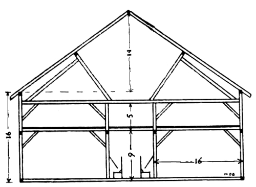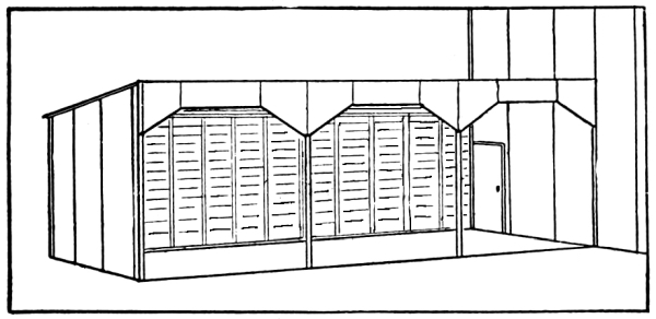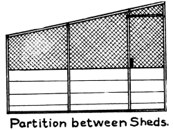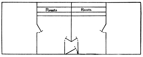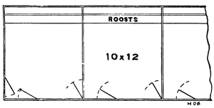Three ventilating cupolas cap the roof, and there are full-sized windows in each gable end. This attic space is storage room for straw, which is drawn upon from time to time, to furnish scratching material for the pen floors and opening the trap-door into the ceiling, it gives excellent ventilation without drafts. A door opens from the alleyway into each pen, and doors in the partition between the pens permit passing through from pen to pen. The roost platforms with nest boxes beneath are against the partition between the walk and pens and the plan of partitions between pens as shown in Fig. 19. The roof is covered with Paroid Roofing. A fault here is the wire netting in these partitions; a better plan would be matched-board partitions throughout.