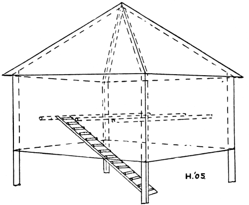 Of similar pattern is the “Mushroom Poultry House,” from Southern California. These houses may be built any size, but are usually made four or five feet square. They set up from the ground about eighteen inches, and the closed sides are three feet, the posts being four and one half above the ground. There is no floor used, the air circulating freely beneath. When built of boards no frame is needed, the boarding being nailed to the posts. The roof goes up from all four sides, in pyramid form, and is made water-tight. The roosts are placed about fifteen or eighteen inches above the bottom, as shown by the dotted lines, and a walk or ladder is provided which leads from the ground to the rear roost. This is made movable, so that it can be taken down at night, thus protecting the fowls from marauding animals.