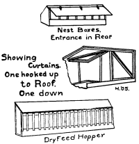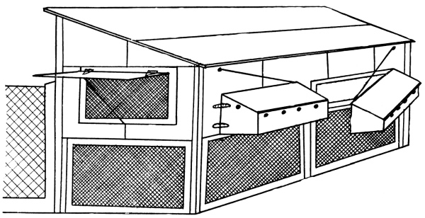 The open space below the house is enclosed by one-inch mesh wire netting; there is no floor, and a narrow platform along the rear, inside, gives the hens access to the nest boxes, which are hinged at one end, and swing out as shown in the drawing. The roost-poles should be a foot above the open bottom, to be quite sheltered from winds.