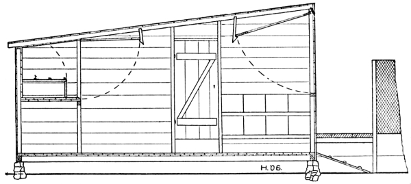 An excellent plan of colony-house is given in Figs. 14 and 15, and comes from the Connecticut Experiment Station; this combines the advantages of the curtained-front scratching-shed with that of the small colony-house. This house is sixteen feet long by six feet wide, [Pg 7] is six feet high in front and four feet high at the rear; the roosting apartment being 7 × 6 feet and the scratching-shed 9 × 6 feet in size. A muslin curtain 4 × 8 feet, tacked to a light frame which is hinged to the top of open space, closes the front on cold nights and is kept closed in stormy weather.