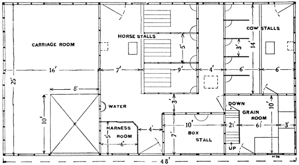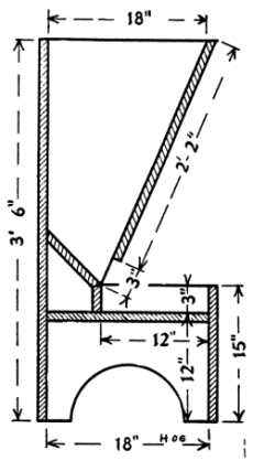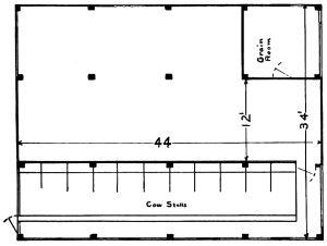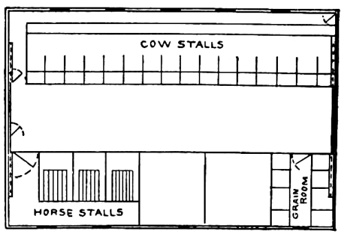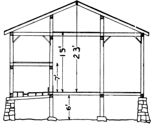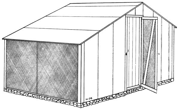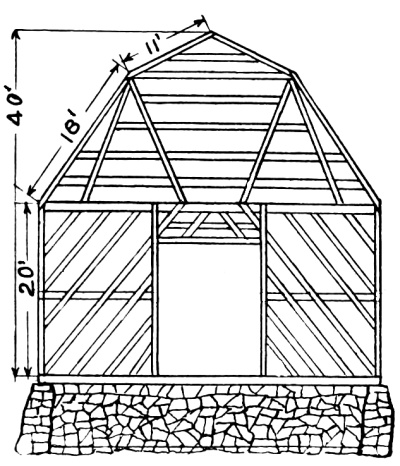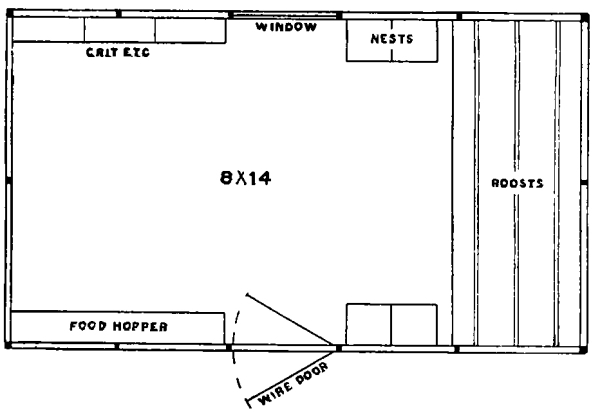 In building a hen-house the working unit is the floor and air space required for each hen. A safe working rule is about five to six square feet of floor space, and about eight to ten cubic feet of air space for every fowl. Foundation walls should be built deep enough to prevent heaving by the frost and high enough to prevent surface water from entering. Where large stones are scarce sometimes grout walls may be made with gravel or small stones and cement; or the building may be set upon posts set well into the ground, in which case hemlock or hard wood boards should be securely nailed to bottom half of sills and extend down to natural ground level, to exclude rats.