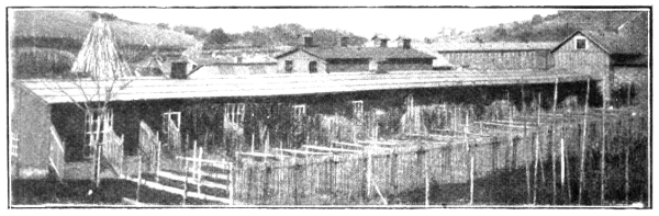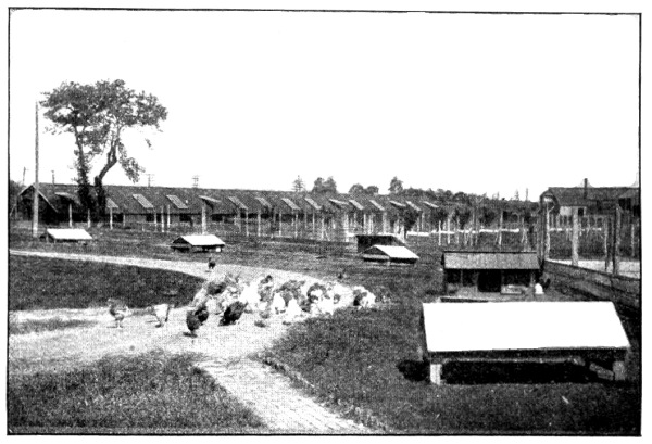 On the Gowell Poultry Farm, Orono, Maine, there is an excellent example of the continuous-house, and by the partial adoption of the dry-feeding method the labor is so far reduced that one man can do all the work of feeding and caring for two thousand head of layers, kept in a house four hundred feet long by twenty feet wide, which is divided into pens twenty feet square and one hundred birds kept in each. The double-yard system is in use here, there being one tier of yards one hundred feet long by twenty feet wide extending south from the house, and another tier of yards the same size north of the house; when the south-yards have been denuded of green food the birds are turned into those north of the house, and the south-yards are plowed and sown (or planted) to a quick-maturing crop. By this method poisoned ground is avoided and the conveniences of the continuous-house retained; the safety of such a plant would lie, of course, in the intelligent handling of the work. It is worthy of note that on the Gowell Farm the portable colony-house method is in use in growing the young stock (see page 42), while the continuous-house method is used with the laying-breeding stock. This is true of practically all of the large poultry farms, it being conceded that free range over farm-fields, or through orchard and woodland, promotes good growth in the young stock. When, however, it is desired to develop the physical energies towards egg-production the semi-confinement of houses and yards is brought into play; in this manner the greatest egg-yield, and consequent profit is obtained.