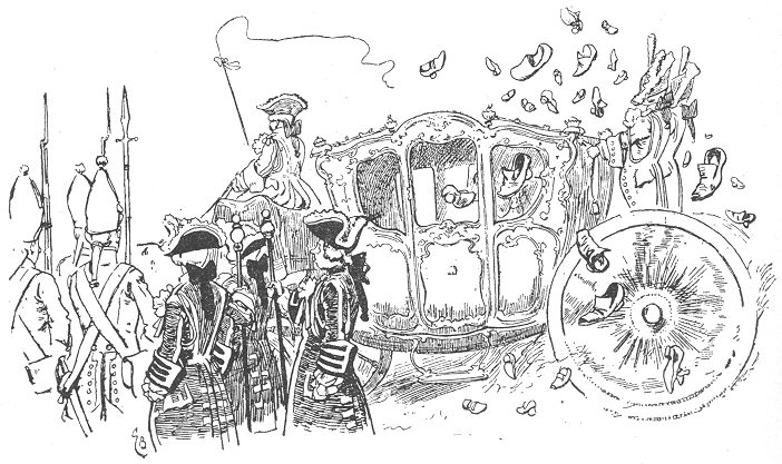 Taking the magic spy-glass, the king surveyed the world from China to Peru, and, sure enough, there was the famous Flying Horse in the p. 175king’s stable at Delhi. Hastily the king thrust his feet into the Shoes of Swiftness—so hastily, indeed, that, as the poet says, he “madly crammed a left-hand foot into a right-hand shoe.” But this, many people think, is a sign of good luck; so he put the shoes on the proper feet, and in a few minutes was in the presence of the Great Mogul.