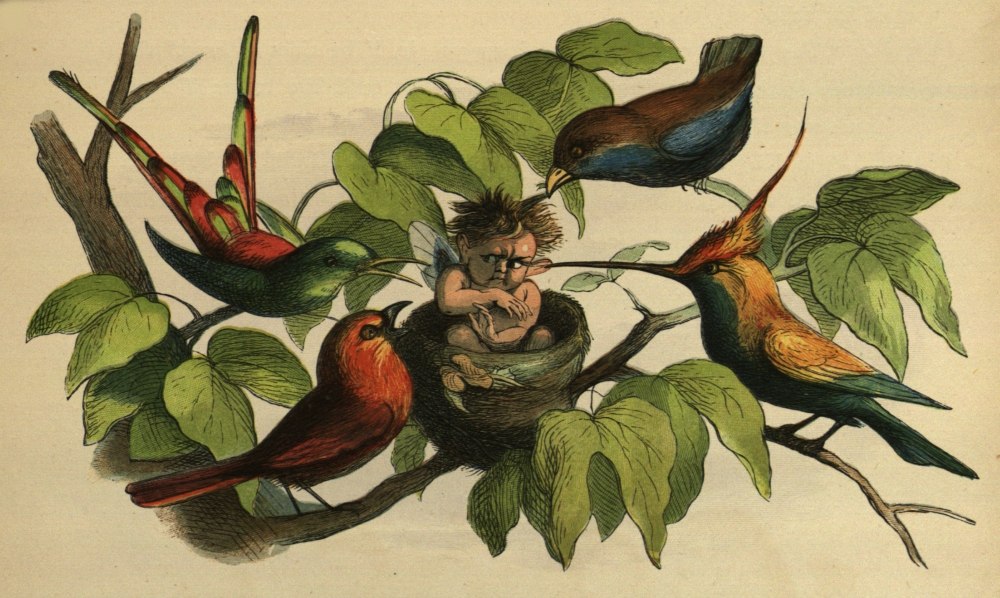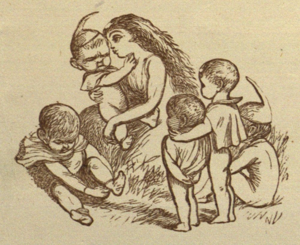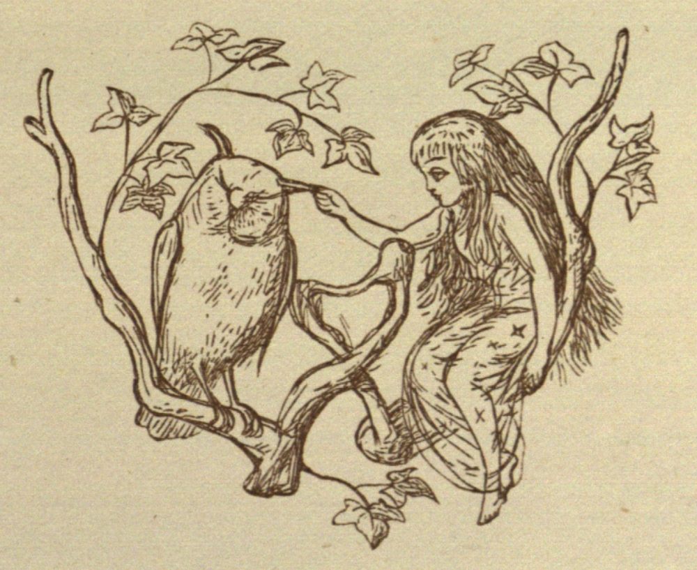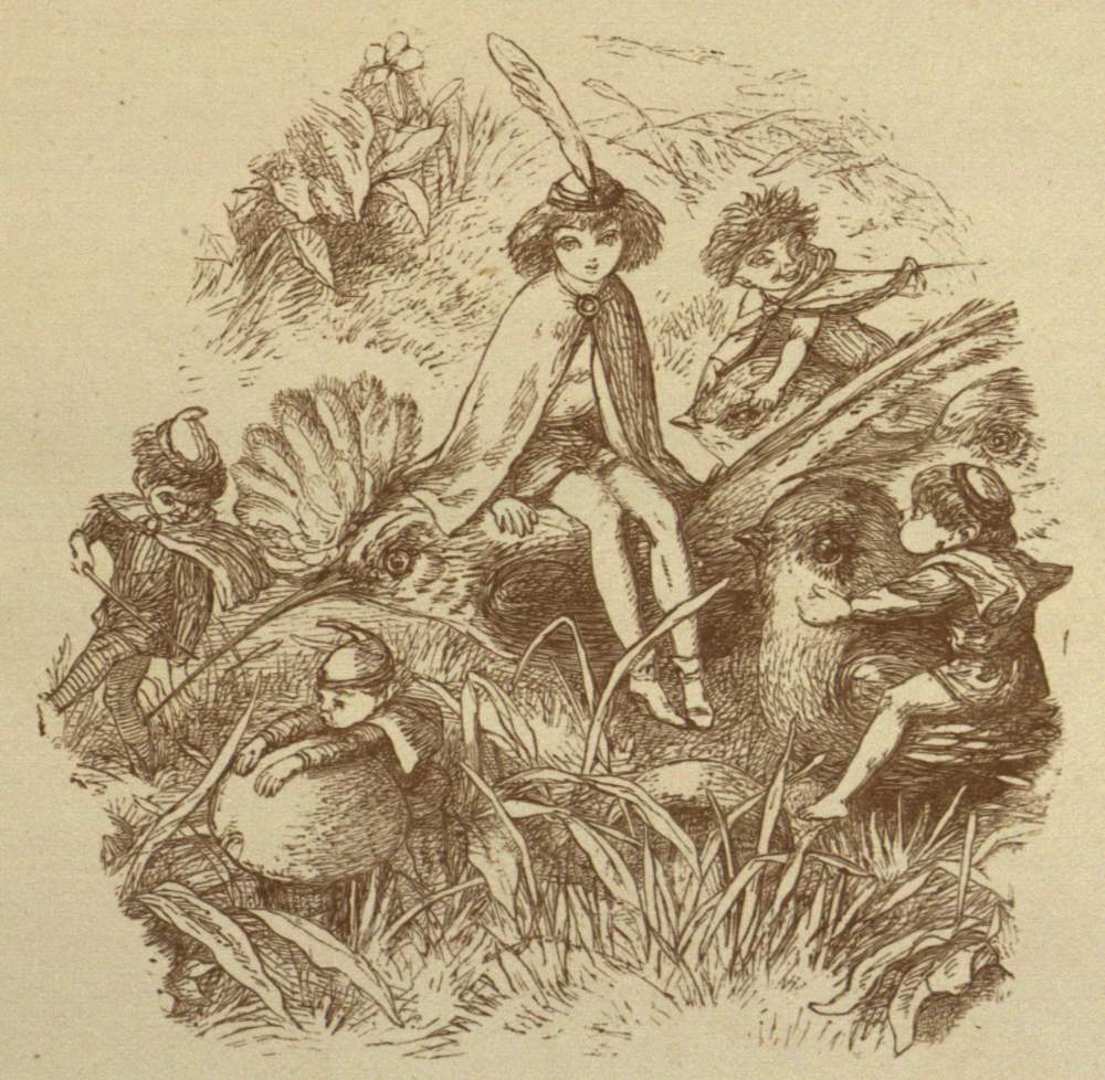 people (who said they “could not see why the first Royal baby should be called ‘Ninety’ ”) always spoke of her as the Princess Nobody. Only the Courtiers called her Niente. The Water Fairy was her Godmother, but (for a Fairy reason) they concealed her real name, and of course, she was not christened Niente. Here you may see her sitting teaching the little Birds to sing. They are all round her in a circle, each of them singing his very best. Great fun she and all her little companions had with the Birds; here they are, riding on them,{16} and tumbling off when the Bird kicks. And here, again, you may observe the baby Princess riding a Parrot, while one of her Maids of Honour teases an Owl. Never was there such a happy country; all Birds and Babies, playing together, singing, and as merry as the day was long.
