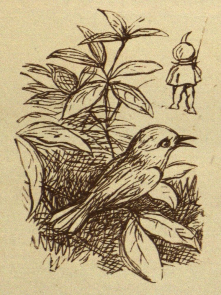 The Prince thought he would chance that, but he did not say so. He only bowed very low, and thanked the Water Fairy. Then off he set, with the Blue Bird to guide him, in search of Mushroom Land. At long and at last he reached it, and glad he was to see the little sentinel on the border of the country.{51}