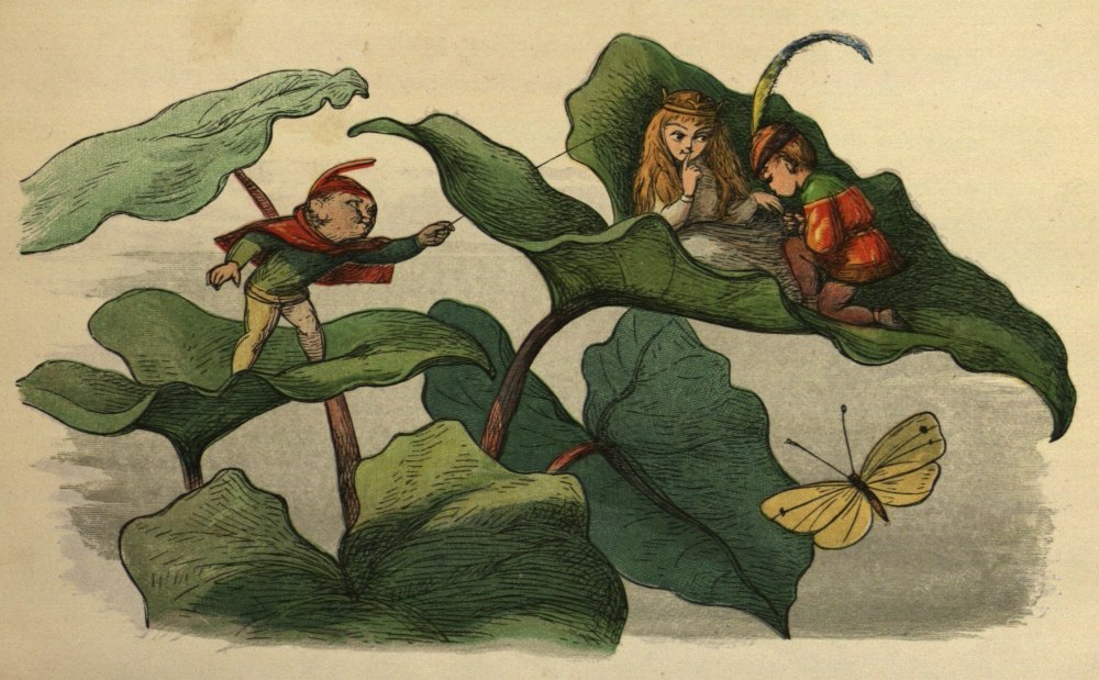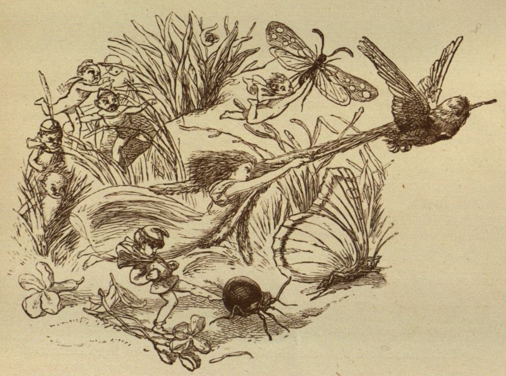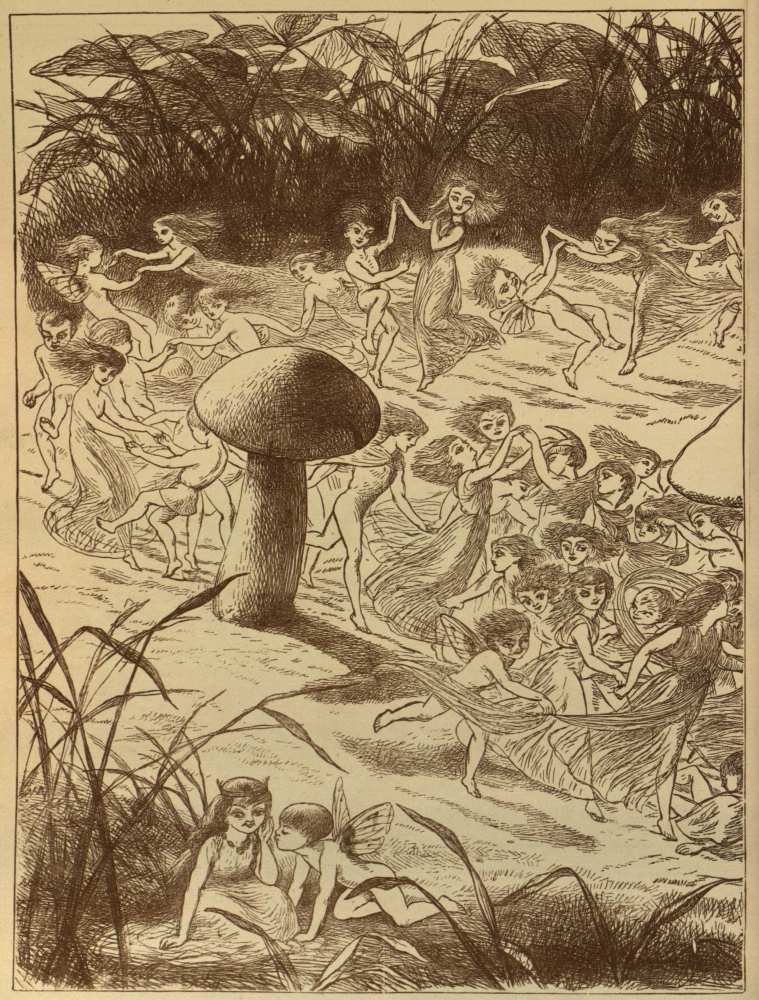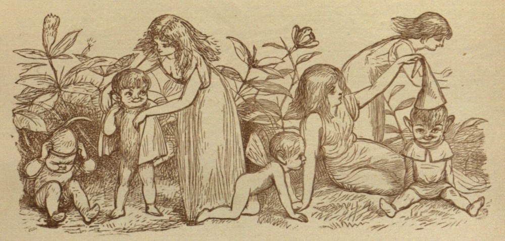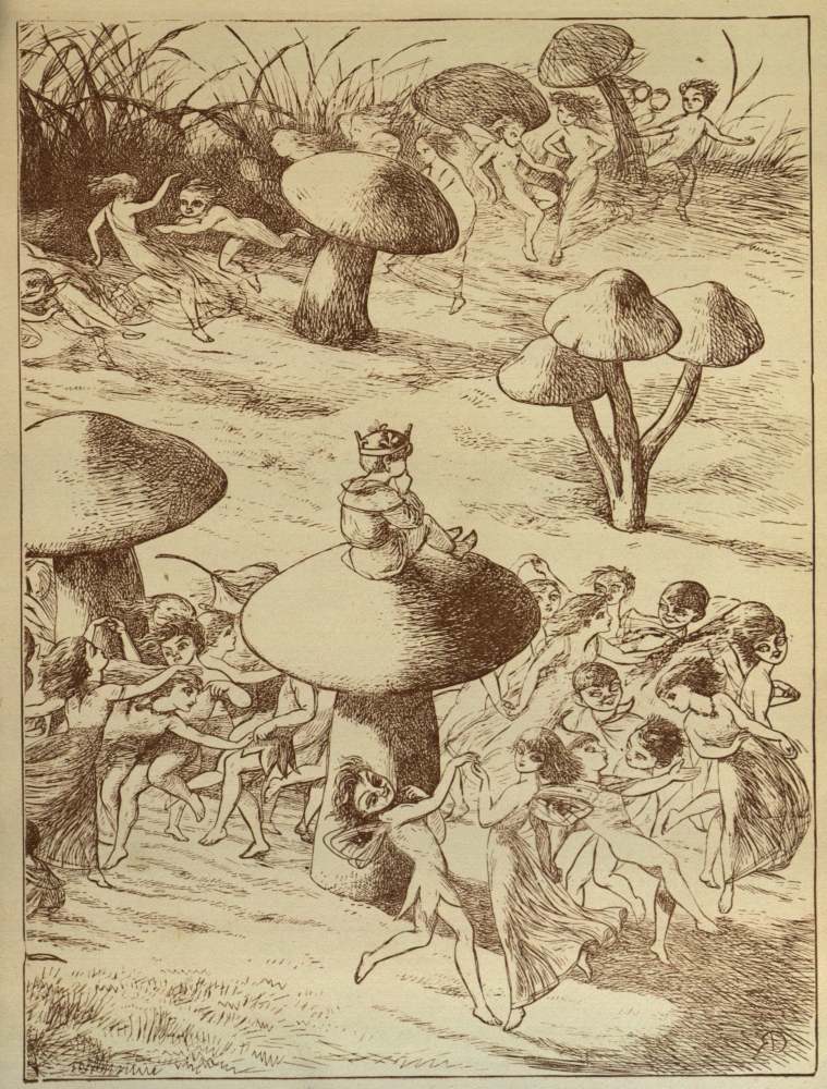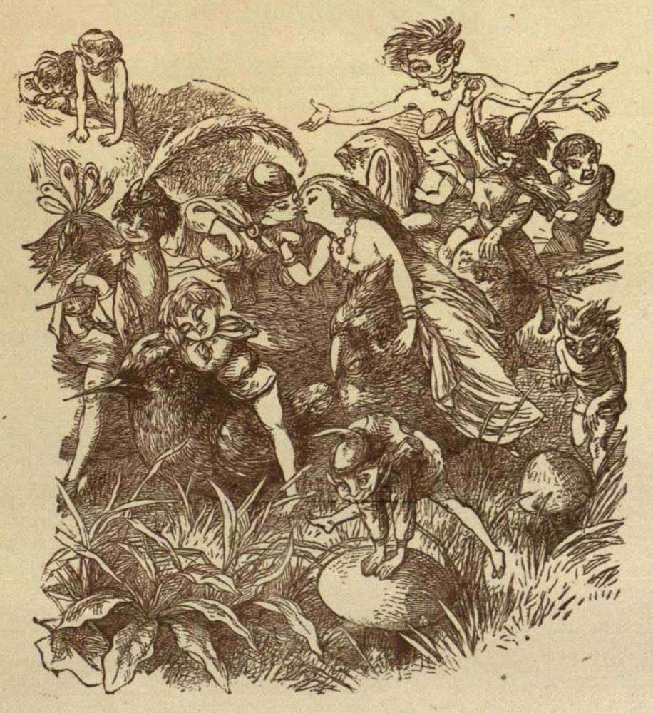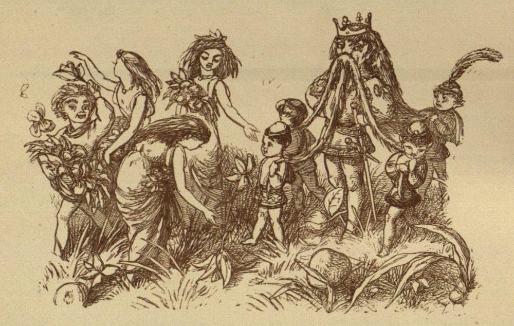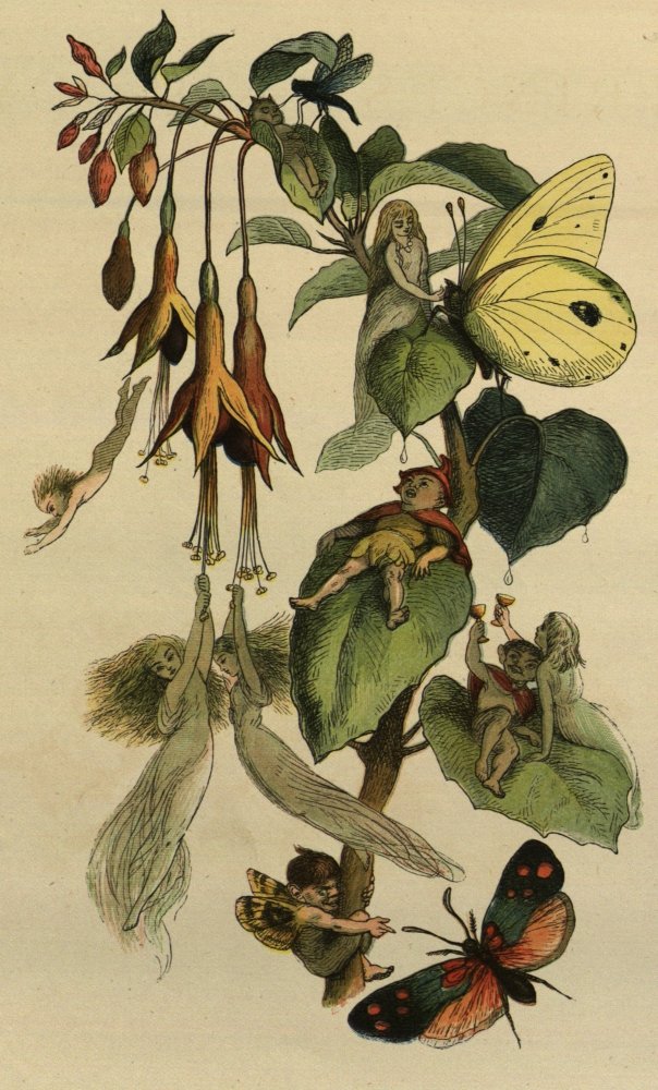 ONCE upon a time, when Fairies were much more common than they are now, there lived a King and a Queen. Their country was close to Fairy Land, and very often the little Elves would cross over the border, and come into the King’s fields and gardens. The girl-fairies would swing out of the bells of the fuschias, and loll on the leaves, and drink the little drops of dew that fell down the stems. Here you may see all the Fairies making themselves merry at a picnic on a fuschia, and an ugly little Dwarf is climbing up the stalk.{10}