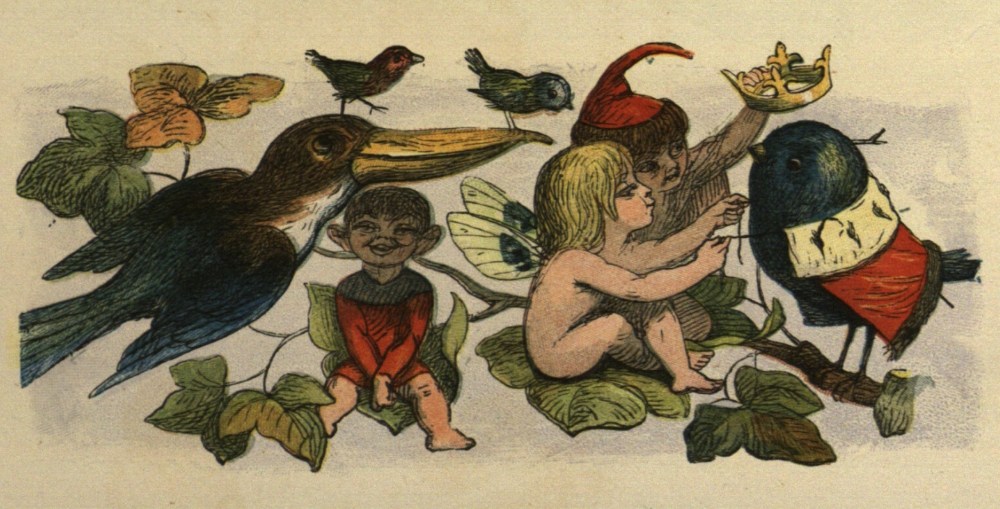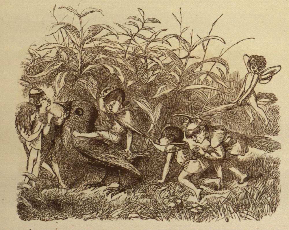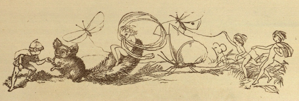 Now, one morning, the Princess awoke very early, but she felt so happy that she could not sleep. She lay awake and listened to the Birds singing, and then she watched a Fairy-boy teasing a Bird, which sang (so the boy said) out of tune, and another Fairy-baby riding on a Fly.