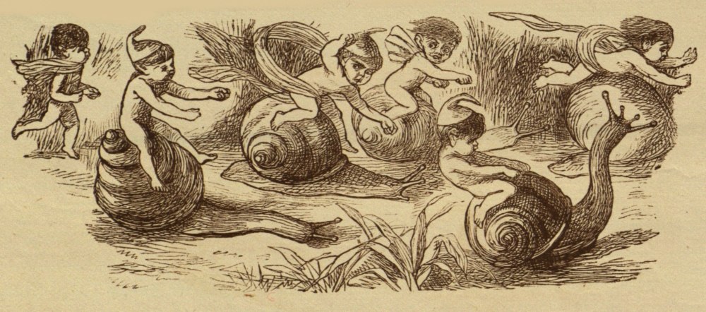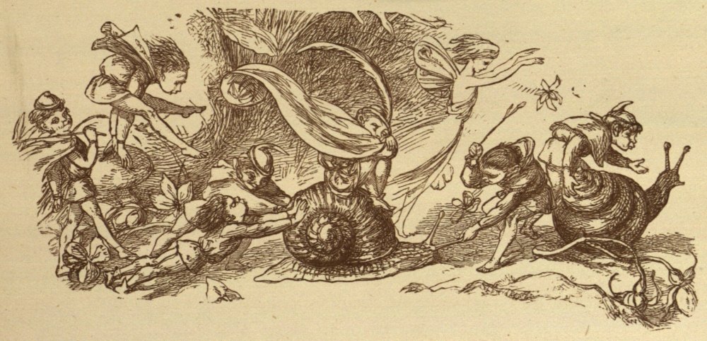 Well, the tournaments were over, and off all the Princes went into Fairy Land. What funny sights they saw in Fairy Land! They saw a great Snail race, the Snails running so fast, that some of the Fairy jockeys fell off on the grass. They saw a Fairy boy dancing with a Squirrel, and they found all the birds, and all the beasts, quite friendly and kind, and able to talk like other people. This was the way in old times, but now no beasts talk, and no birds, except Parrots only.