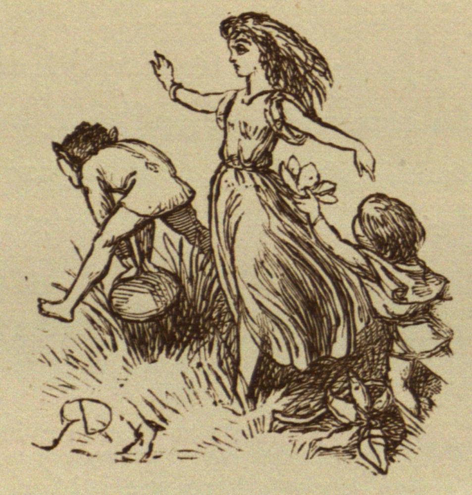 When the King heard that, and remembered that he had promised to give NIENTE to the Dwarf, he hid his face in his hands and groaned. Nobody knew what he meant, or why he was sad, so he thought it best to keep it to himself. He went in and kissed the Queen, and comforted her, and looked at the BABY. Never was there a BABY so beautiful; she was like a Fairy’s child, and so light, she could sit on a flower and not crush it. She had little wings on her {15}back; and all the birds were fond of her. The peasants and common