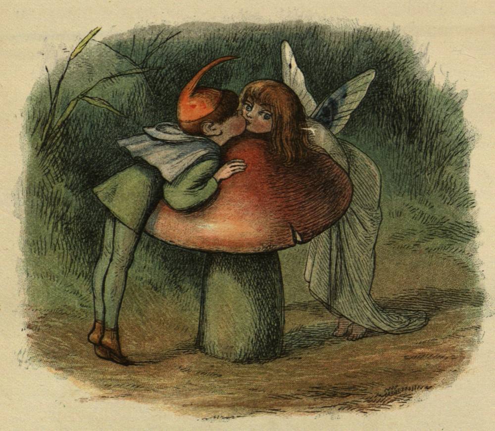 So he chased her for a minute or two, and at last she laughed, and popped up her head over the Mushroom, and pursed up her lips into a cherry. And he kissed her across the Mushroom, and knew he had won back his own dear Princess, and they felt even happier than if they had never been parted.