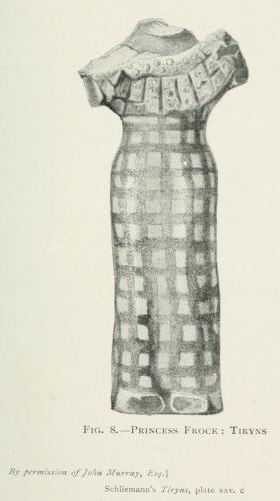 Turning then to what we shall style the Four Ages, we observe first, that which is called the "Late Minoan," namely the bloom, in Crete and on the mainland, of a civilisation even then very ancient, having its focus, and chief manifestation, in the isle of the Hundred Cities. Here the art is most graphic, a revelation of the life; the palaces are most numerous and most magnificent; the towns are most tranquil, being unwalled, as the palaces are unfortified; while the arrangements, as for sanitation; and the costume of the women at some periods, are quite modern in character. Separate bodices and skirts, heavily flounced, were worn; through all varieties of fashion the dresses were sewn and shaped. Men did not, as a rule, wear the Homeric smock or chiton, but loin-cloths or bathing-drawers. Brooches or fibulae, like safety pins, were not in use.