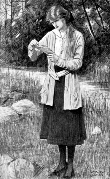 [284]Early in the afternoon, Marjorie, wishing to be alone, took a stroll down the dingle. It was a favourite haunt of Chrissie's, who had often sat reading beside the little brook. Marjorie walked to the very stone that had been her usual seat. The sharpenings of a lead pencil were still there, and lying at the edge of the water was a crumpled-up piece of paper. Marjorie picked it up and smoothed it out. It was in Chrissie's writing, and contained a list of details in connection with tanks and guns, also particulars of the Redferne munition works and the Belgian colony there, and several other pieces of information in connection with the war. She stared at it in consternation. A sudden light began to break in upon her mind.