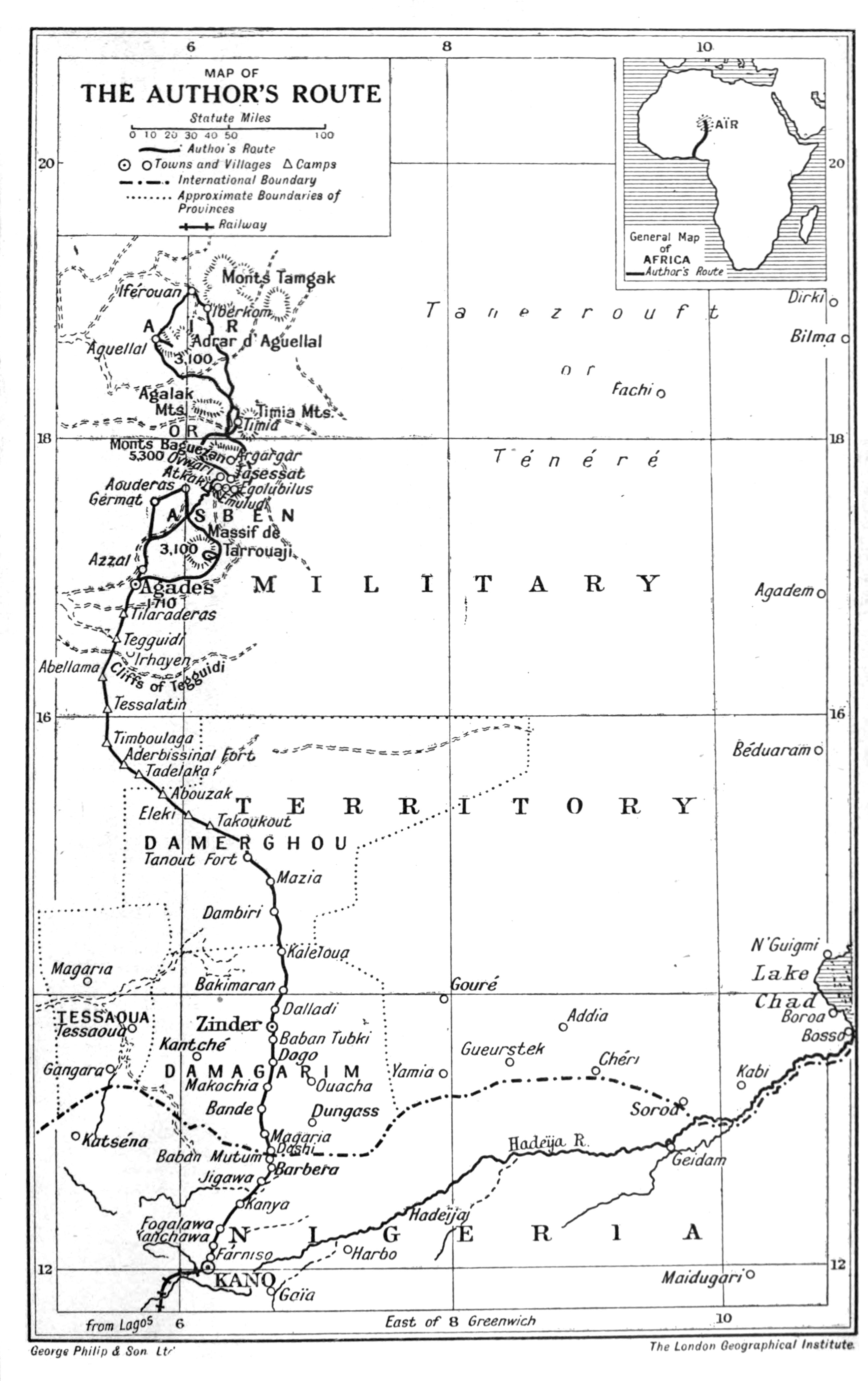 The primary object of the Expedition, which was undertaken in the interests of the Right Honourable Lord Rothschild, was to link up the chain of Zoological Geography across that portion of Central Africa which lies between Algeria in Northern Africa and Nigeria in West Africa. Previous research had advanced from the south as far afield as Kano in Nigeria, and from the north to the Ahaggar Mountains in the Sudan southwest of Fezzan. There remained a great intermediate space unexplored by naturalists, wherein are the French possessions known as the Territoire Militaire du Niger and the unsettled mountainous region of Aïr or Asben; and it was through those[xv] said countries that the expedition proposed to journey.