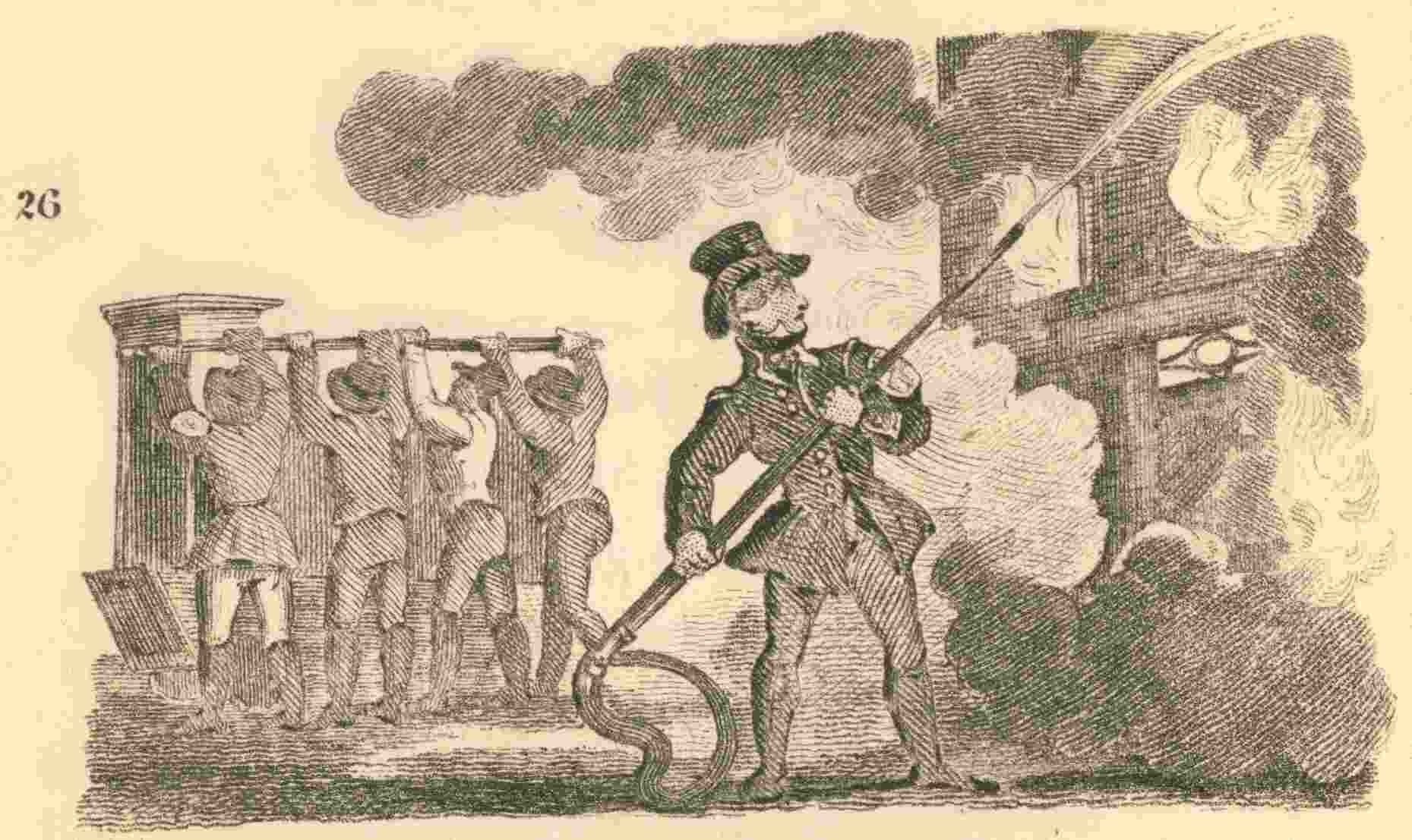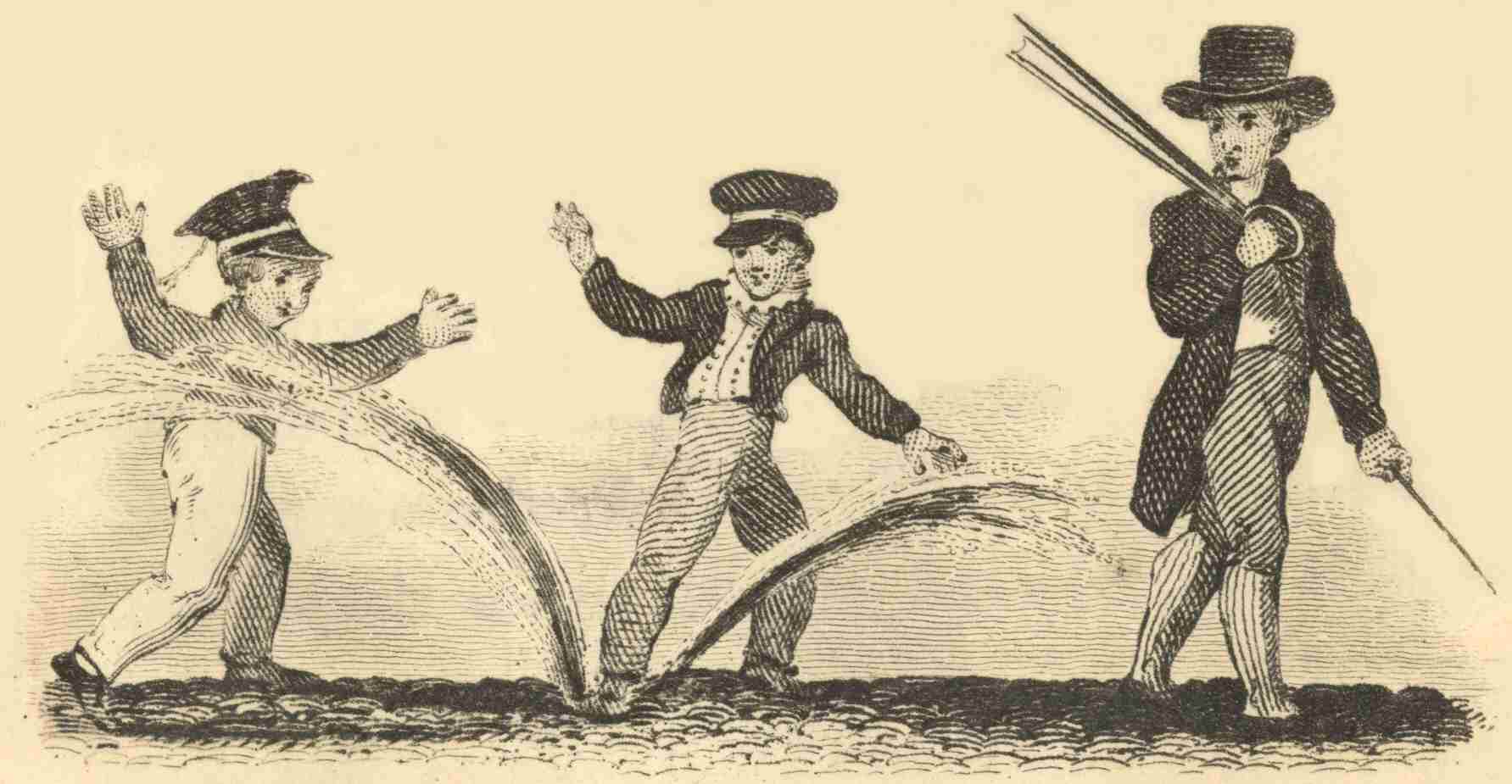 The turn-cock, as he is called, has just opened a fire-plug, or rather water-plug; but as its principal use is to supply water to the engines for extinguishing fires, it has acquired the former name, more from custom than propriety. Some boys make rare sport, by putting one foot on the stream, and dividing the course of the water; it is thus driven into the air, and over their companions or passengers.