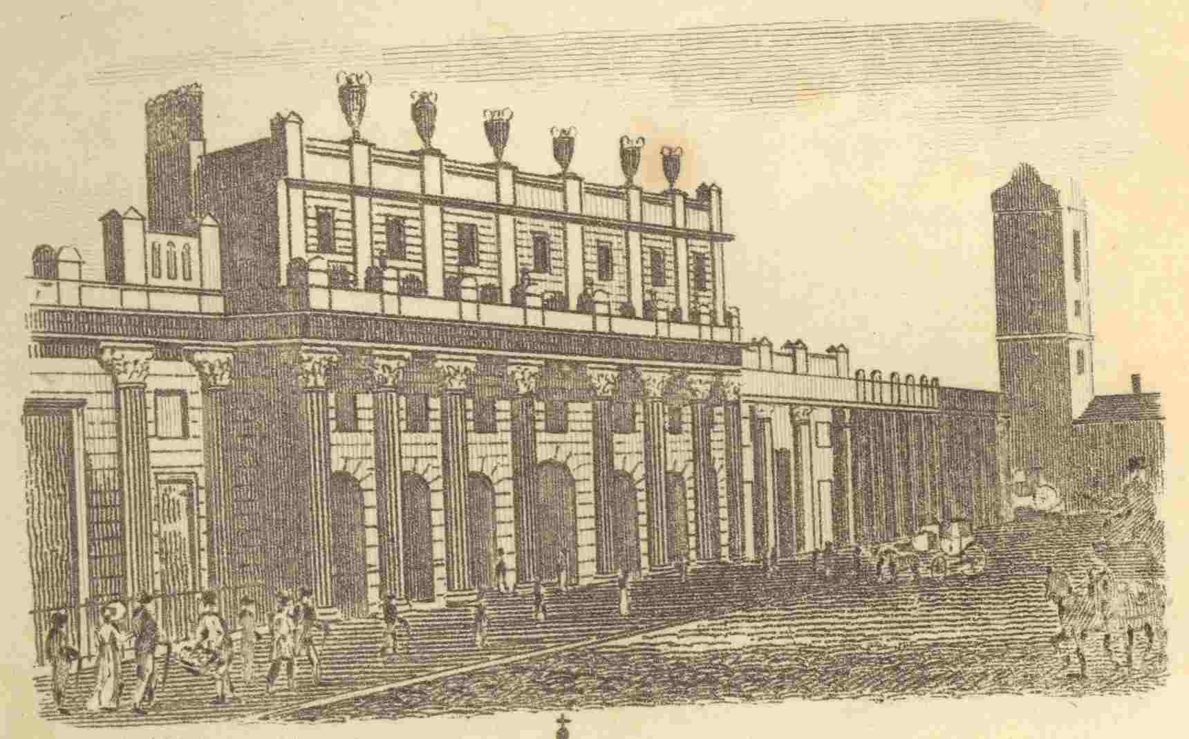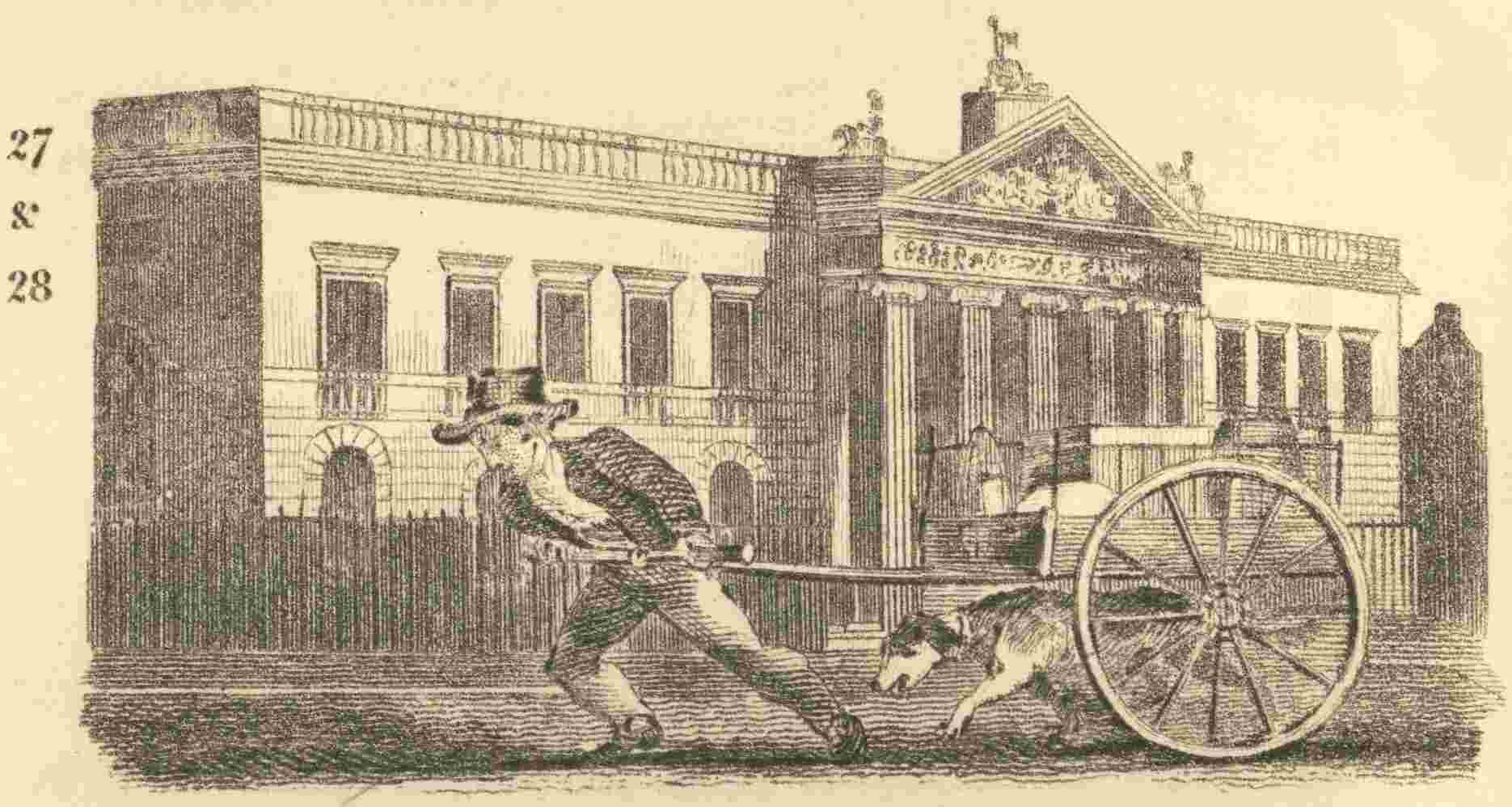 This is one of the most beautiful of the new improvements at the west end of the town, and is thought to be the most singular and magnificent p. 67line of streets in the world. At the entrance of the Quadrant stands the County Fire Office. The Building is surmounted by a colossal statue of Britannia, behind which is an observatory, which affords a view over London and the surrounding villages; the purpose of which is, that, on an alarm of fire, the managing director may ascertain the position in which it lies, and send the engines, which are kept at the back of the building.