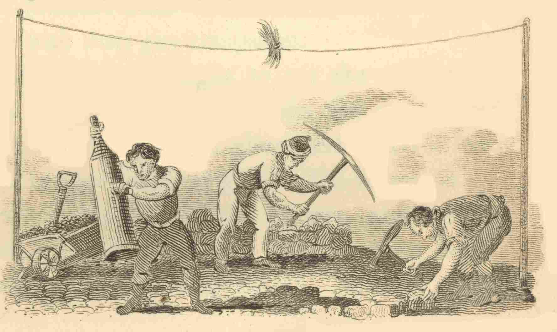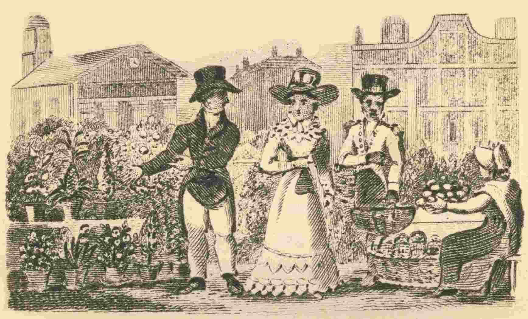 Now we have a view of Covent Garden Market, where plants, fruit, and flowers of every kind, are brought for sale from the country. By four o’clock in a summer’s morning, it is completely full of the most rare and beautiful plants that can be grown in England, either in open nurseries, or in the hot-house and green-house: and, what with the number of busy people buying and selling; the carts going to and fro, laden with flowers, fruit, and vegetables of all sorts; the beauty and p. 64gaiety of the different plants, and the sweetness of their odours, it is altogether a most delightful scene. The Londoners cannot take a country walk whenever they please, and enjoy the green fields and wild hedge-flowers, in the open air; but they may supply themselves here with every kind of beautiful plants, for a garden within doors; and to those who have a little knowledge of botany, it must be not only an entertaining, but even a useful amusement.
