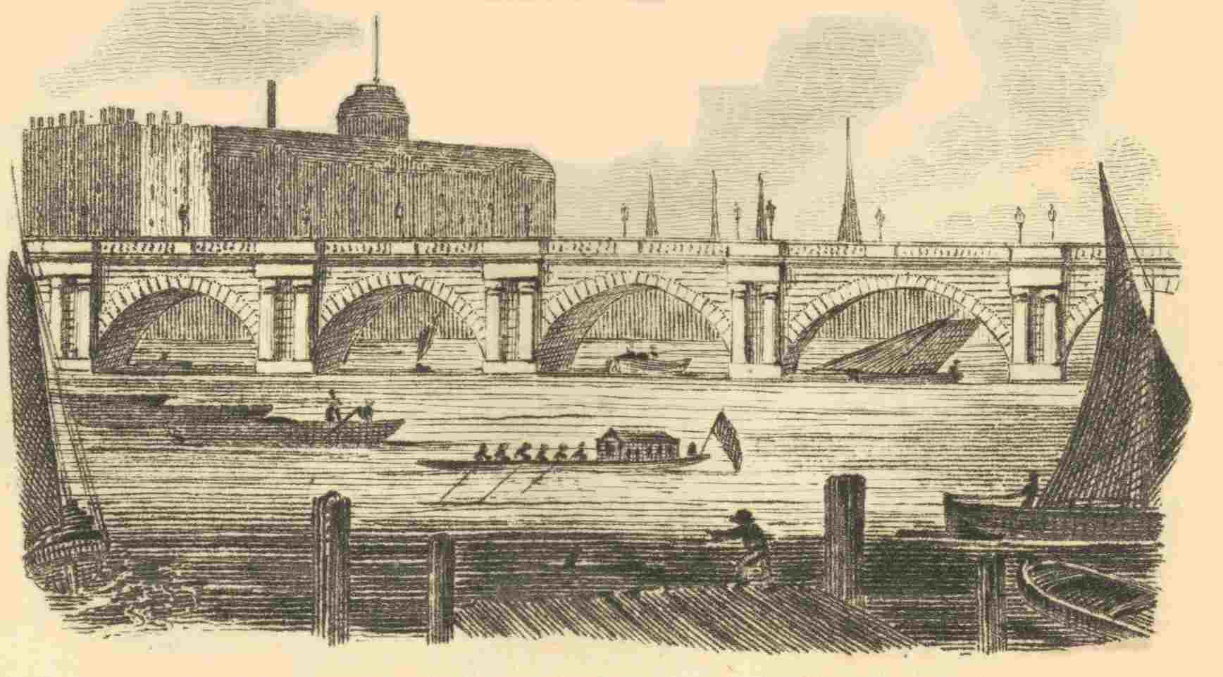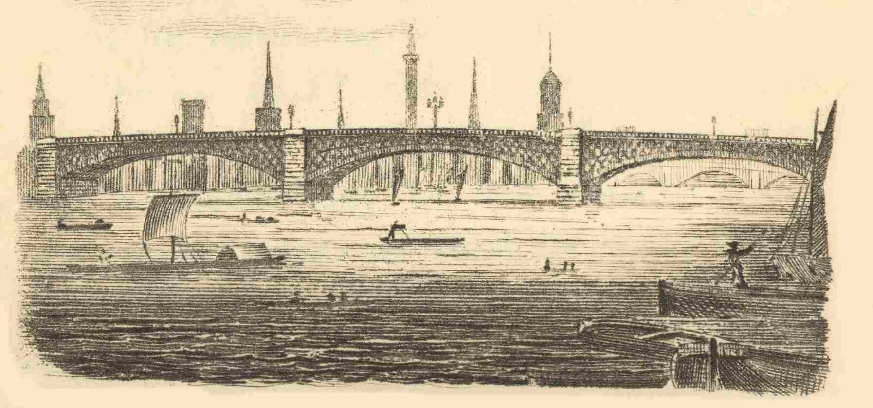 The new London Bridge is built from a design of the late John Rennie, Esq. engineer; p. 6and the works are conducted under the direction of John and George Rennie, Esqrs. It stands a short distance westward of the old bridge. The first stone was laid by John Garratt, Esq. lord mayor, on the 15th of June, 1825.