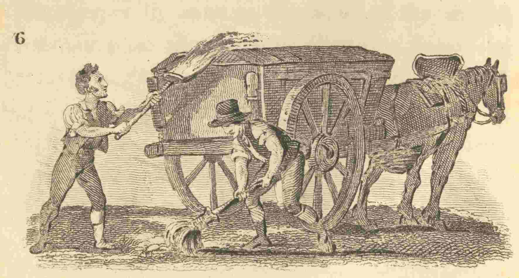 I am glad to see this man, whose business it is to sweep up the mud and dirt from the streets, and collect it in a cart. Surely, no part of London needs this work more than Thames Street and Billingsgate; for, even in a dry season, the narrowness of the streets, and great traffic of men and women, with fish in wet baskets, &c. keep the pavement constantly dirty. When the cart is well laden, he empties it into some waste place in the outskirts of the town, or delivers it at some wharf by the water-side; and as it proves a very rich manure, he finds it a profitable and useful occupation.