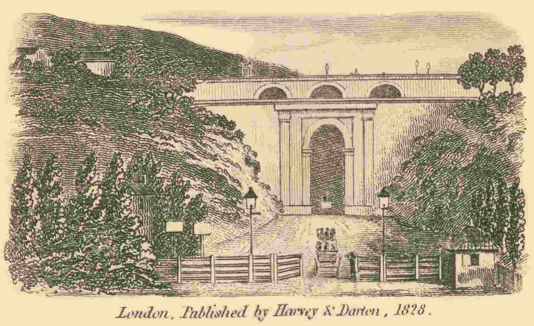 This grand excavation was made in 1821, through the eastern side of Highgate-hill, for the purpose of easing the draught of horses in passing in this direction. There is also a grand archway across, over the Tunnel, which connects Highgate with Hornsey.
