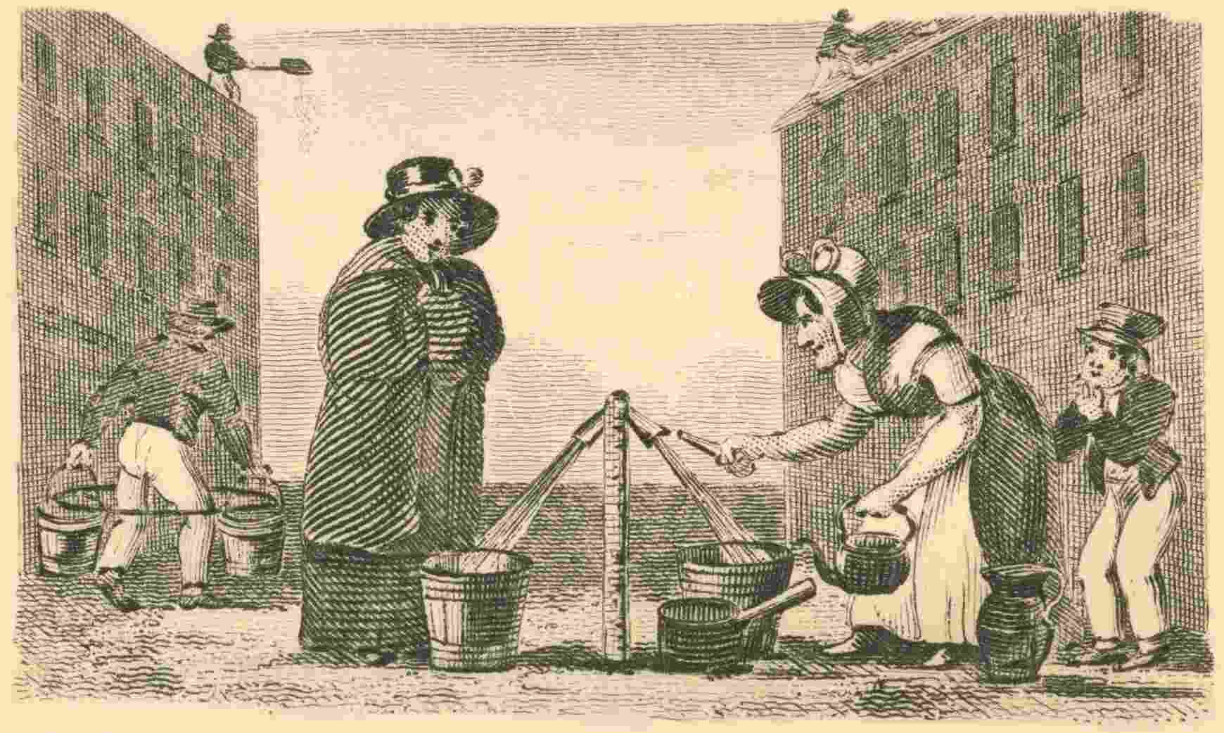 What a picture of winter! The water in the leaden pipes, leading from the large iron ones underground, into the houses, is frozen. As some part of the pipe is generally exposed to the cold air, this stoppage frequently happens in a frost, so that the turn-cock is obliged to put a small wooden pipe into one of the large ones underground, [75] that the people may procure water. The poor woman’s cloak is frozen so p. 76hard, that it looks like a great wing. The little boy blows his fingers to make them warmer: and there is a man throwing the snow off the house, that it may not soak through to the chamber ceiling when a thaw comes. What a blessing to have a good house and a comfortable fire-side, when the weather is so severe.
