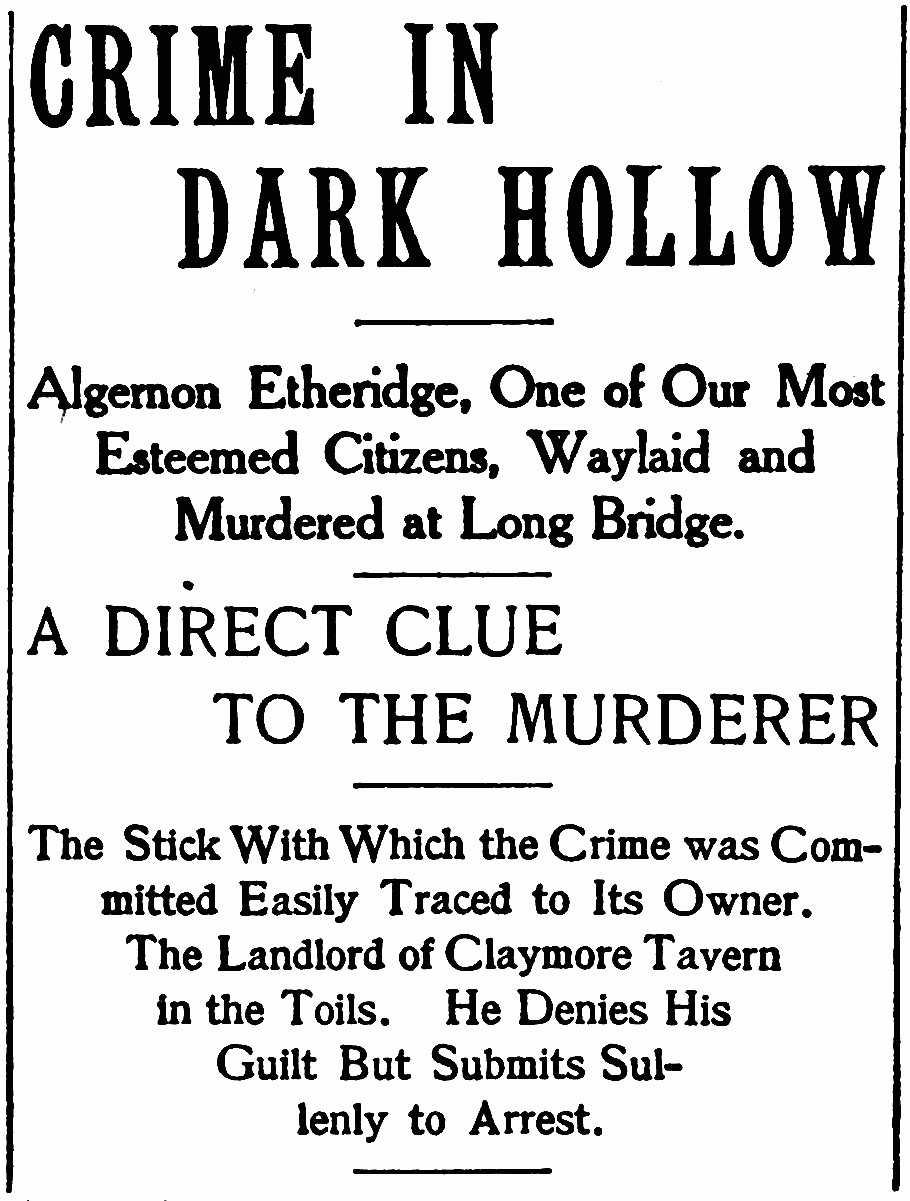 But the days went by and the inexorable hour drew nigh for the accused man's release or condemnation. Circumstances were against him—so was his bearing which I alone understood. If, as all felt, it was that of a guilty man, it was so because he had been guilty in intent if not in fact. He had meant to attack Etheridge. He had run down the ravine for that purpose, knowing my old friend's whistle and envying him his watch. Or why his foolish story of having left his stick behind him at the chestnut? But the sound of my approaching steps higher up on the path had stopped him in mid-career and sent him rushing up the slope ahead of me. When he came back after a short circuit of the fields beyond, it was to find his crime forestalled and by the very weapon he had thrown into the Hollow as he went skurrying by. It was the shock of this discovery, heightened by the use he made of it to secure the booty thus thrown in his way without crime, which gave him the hang-dog look we all noted. That there were other reasons—that the place recalled another scene of brutality in which intention had been followed by act, I did not then know. It was sufficient to me then that my safety was secured by his own guilty consciousness and the prevarications into which it led him. Instead of owning up to the encounter he had so barely escaped, he confined himself to the simple declaration of having heard voices somewhere near the bridge, which to all who know the ravine appeared impossible under the conditions named.