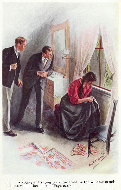 A young girl sitting on a low stool by the window mending a rent in her skirt (Frontispiece)