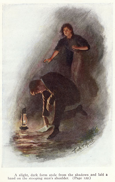 "A slight, dark form steals from the shadows and lays a hand on the stooping man's shoulder"