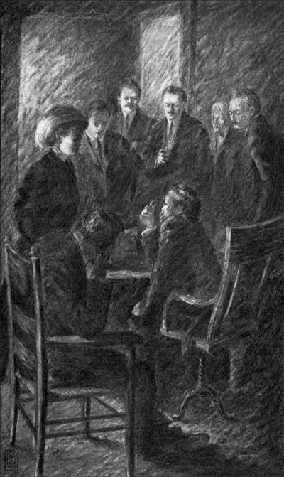 She did as she was bid, and in a moment more they were crossing the floor outside. As they did so, she noticed that the two clerks had been sent out to luncheon, leaving them alone with Mr. Fellows. This was not encouraging, nor did she like the click which at this moment Beau Johnson[133] made with his tongue. It sounded like a preconcerted signal. Whether so or not, it brought Mr. Fellows from his room, and in another instant he was standing with them before the telephone. There was a clock over the safe-room door. It stood at just twenty-five minutes after eleven.