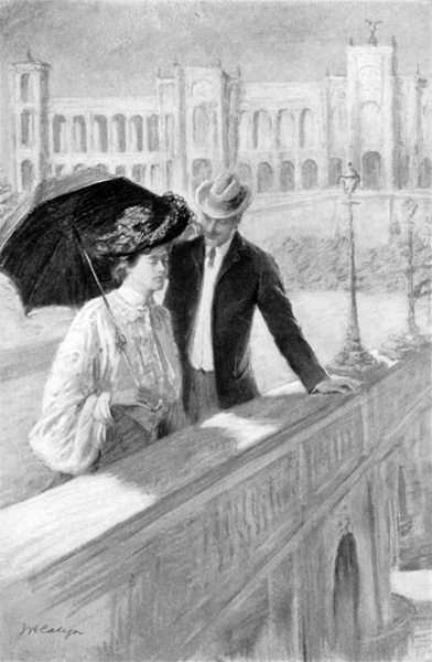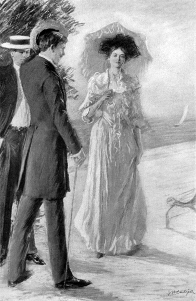 And, if the truth must be told, it is to be feared that if Rosina’s unhappy suitor could have caught a glimpse of her as night fell over that same day’s ending, his sickest doubts would have found food for reflection and consequent misery in her situation, for when Ottillie, the Swiss maid, came up on deck with a great, furred wrap, the most personable man aboard was already installed at her mistress’s side, thanks to a convenient college acquaintance with her dearest of cousins; and the way that the personable man grabbed the cloak from Ottillie and heaped it gently around[8] its owner would have stirred the feelings of any casual lover whose bad luck it might be to happen along just then.