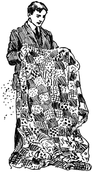 "What under the canopy!" he muttered, beginning to unfold it. "Well, I'll be—jiggered!" he exclaimed, as the familiar squares of faded patchwork met his eye. "It's that old quilt I made for mother!" He had forgotten its existence, but now, as he spread it out full length, smiling at the well-known object, it seemed only yesterday that he had been at work upon it. Rob's old teasing rhyme came back to him: