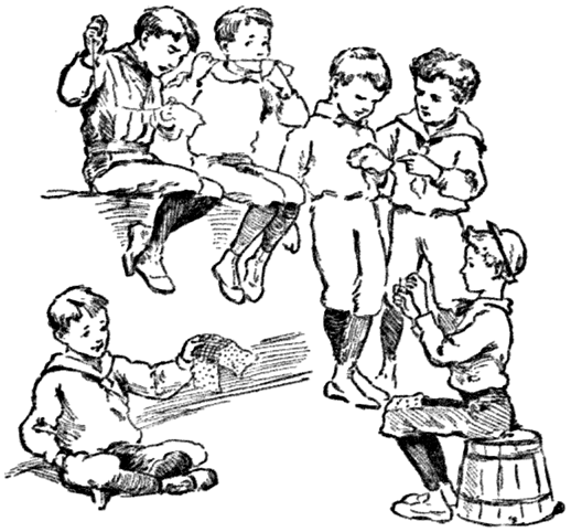 Every boy in the neighbourhood seemed to be there, and every one was making patchwork. One boy was dangling his feet over the manger, several were perched on a ladder, and one was sitting cross-legged on a huge pumpkin. Johnny was going around as Grand Inquisitor from one to another. If a seam was puckered, he gave the unlucky seamstress what they called a "hickey,"—a tremendous thump on the head with his thumb and middle finger. If the stitches were big and uneven, he gave two hickeys and a pinch, and one boy got half a dozen, because Johnny said his dirty hands made the thread gray. Mrs. Marshall gathered that it was some sort of secret society, and that they had signed an oath in their own blood not to tell.