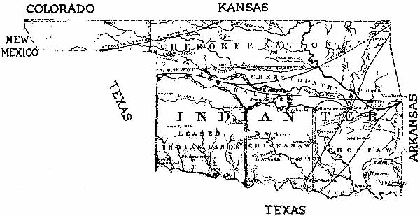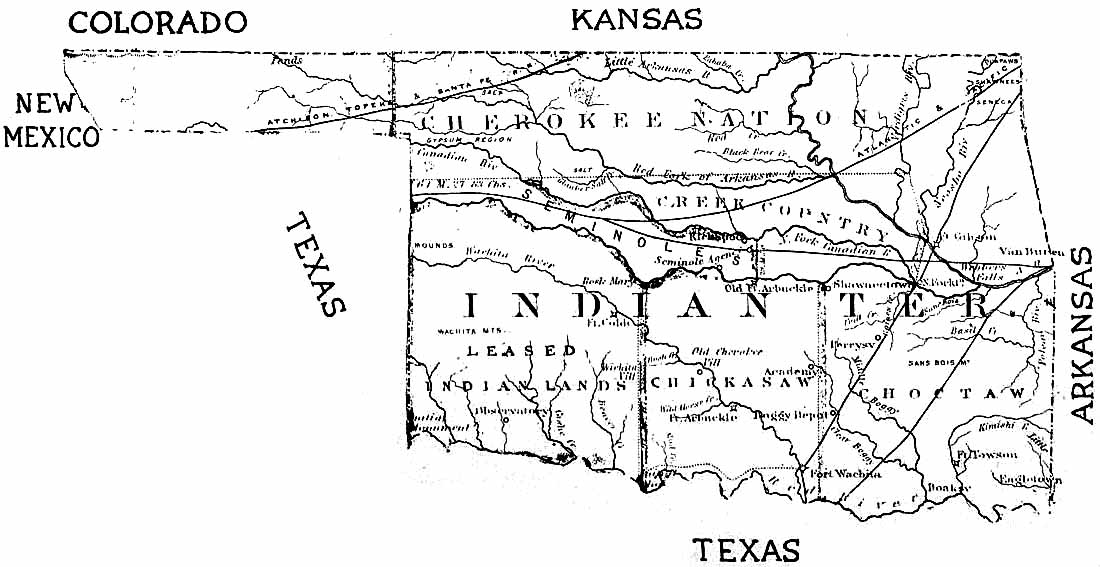 [Pg 67]The Quapaws, the Senecas, and the confederated Senecas and Shawnees, the most insignificant of the lesser, occupied the extreme northeastern corner of Indian Territory and, therefore, bordered upon the southwestern corner of Missouri. The Creeks lived between the Arkansas River, inclusive of its Red Fork, and the Canadian River, having the Cherokees to the east and north of them, the Choctaws and Chickasaws to the south, and the Seminoles to the southwest, between the Canadian and its North Fork. The Indians of the Leased District have already been located.