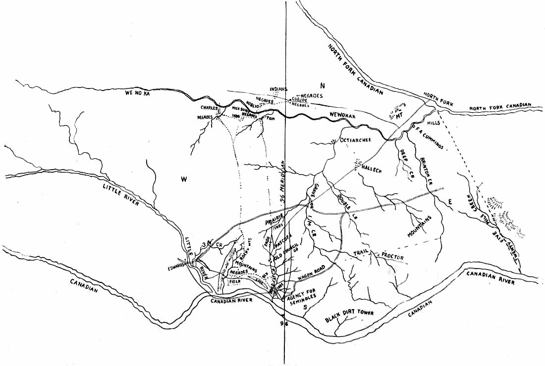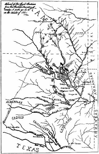 The other great tribes had also occasions for quarrel in these same critical years. The disgraceful circumstances of their removal had widened the gulf, once simply geographical, between the Upper and the Lower Creeks. They were now almost two distinct political entities, in each of which there were a principal and a second chief. In 1833, provision had been made for the accommodation of the Seminoles within a certain definite part of the Creek country[65]—just such an arrangement, forsooth, as worked so ill when applied to the Choctaws and Chickasaws; but it took several years for the Seminoles to be suited. At length, when their numbers had been considerably augmented by the coming of the new immigrants from Florida, they took up[Pg 51] their position, for good and all, in the southwestern corner of the Creek Reserve, a politically distinct community. By that time, the Creeks seem to have repented of their generosity,[66] so, perhaps, it was well that the United States government had not yielded to their importunity and consented to a like settlement of the southern Comanches.[67] It had taken the Chickasaws a long time to reconstruct their government after the political separation from the Choctaws; but now they had a constitution,[68] all their own, a legislature, and a governor. The Choctaws had attempted a constitution, likewise, first the Scullyville, then the Doaksville, set up by a minority party; but they had retained some semblance of the old order of things in the persons of their chiefs.[69]