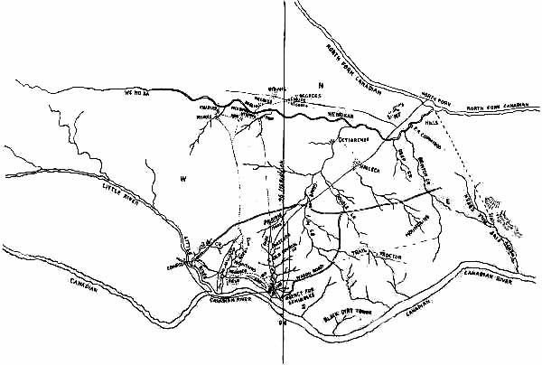For the participation of the southern Indians in the American Civil War, the states of Texas and Arkansas were more than measurably responsible. Indian Territory, or that part of the Indian country that was historically known as such, lay between them. Its southern frontage was along the Red River; and that stream, flowing with only slight sinuosity downward to its junction with the Mississippi, gave to Indian Territory a long diagonal, controlled, as far as situation went, entirely by Texas. Texas lay on the other side of the river and she lay also on almost the whole western border of Indian Territory.[99] She was, consequently, in possession of a rare opportunity, geographically, for exercising influence, should need for such ever arise. Running parallel with the Red River and northward about one hundred miles, was the Canadian. Between the two rivers were three huge Indian reservations, the most western was the Leased District of the Wichitas and allied bands, the middle one was the Chickasaw, and the eastern, the Choctaw.[100] The Indian occupants of these three reservations were, therefore, and sometimes to their sorrow, be it said, the very next door neighbors[Pg 64] of the Texans. The Choctaws were, likewise, the next door neighbors of the Arkansans who joined them on the east; but the relations between Arkansans and Choctaws seem not to have been so close or so constant during the period before the war as were the relations between the Choctaws and the Texans on the one hand and the Cherokees and the Arkansans on the other.
