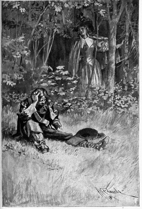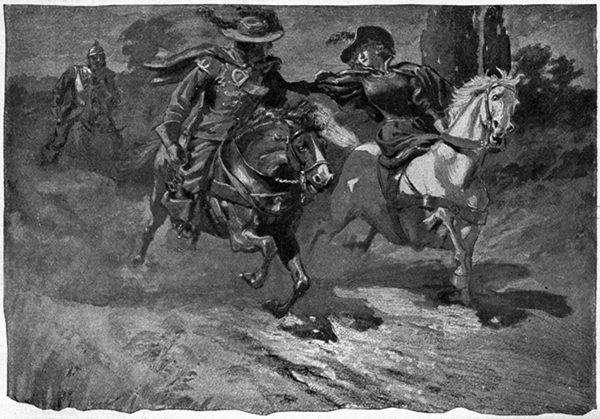 But the officer's horse was going so furiously that he could not stop it for hard on forty yards; he narrowly escaped splitting his head against a great bough that hung low across the grassy path, and he dropped first his own sword and then the King's; but at last he brought his horse to a standstill, and, leaping down, ran back towards where the swords lay. But at the moment the King also ran towards them; for the fury that he had been in before was as nothing to that which now possessed him. After his sword was snatched from him he stood in speechless anger for a full minute, but then had turned to pursue the man who had dared to treat him with such insult; and now, in his desire to be at the officer, he had come very near to forgetting the student. Just as the officer came to where the King's sword lay and picked it up, the King in his turn reached the officer's sword and picked up that. The King came with [pg 289] a rush at the officer, who, seeing that the King was likely to kill him, or he the King, if he stood his ground, turned tail and sped away at the top of his speed through the forest; but as he went, thinking that the time had come for plain speaking, he looked back over his shoulder and shouted: