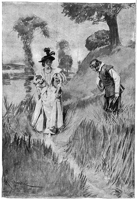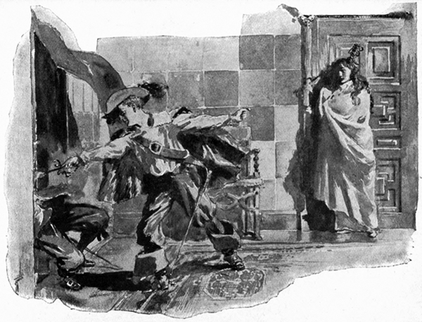 Thus, while the ambassador and his men searched high and low for the noted robber, and the King's men hunted for the student of the University, the King, followed by two of his Guards at a distance of about [pg 287] fifty yards (for his horse was better than theirs), came straight to where Osra and her lover stood together; a few yards behind the Guards came the officer; and he also had by now drawn his sword. But he rode so eagerly that he overtook and passed the King's Guards, and got within thirty yards of the King by the time that the King was within twenty of the lovers. But the King let him get no nearer, for he dug his spurs again into his horse's side, and the animal bounded forward, while the King cried furiously to his sister: "Stand away from him!"