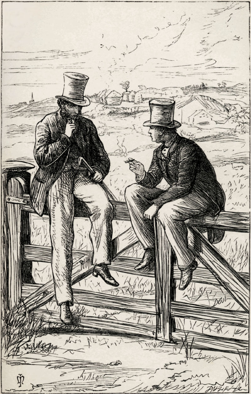 Orley Farm-house itself is somewhat more than a mile distant from the town of Hamworth, but the land runs in the direction of the town, not skirting the high road, but stretching behind the cottages which stand along the pathway; and it terminates in those two fields respecting which Mr. Dockwrath the attorney became so irrationally angry at the period of which we are now immediately about to treat. These fields lie on the steep slope of Hamworth Hill, and through them runs the public path from the hamlet of Roxeth up to Hamworth church; for, as all the world knows, Hamworth church stands high, and is a landmark to the world for miles and miles around.