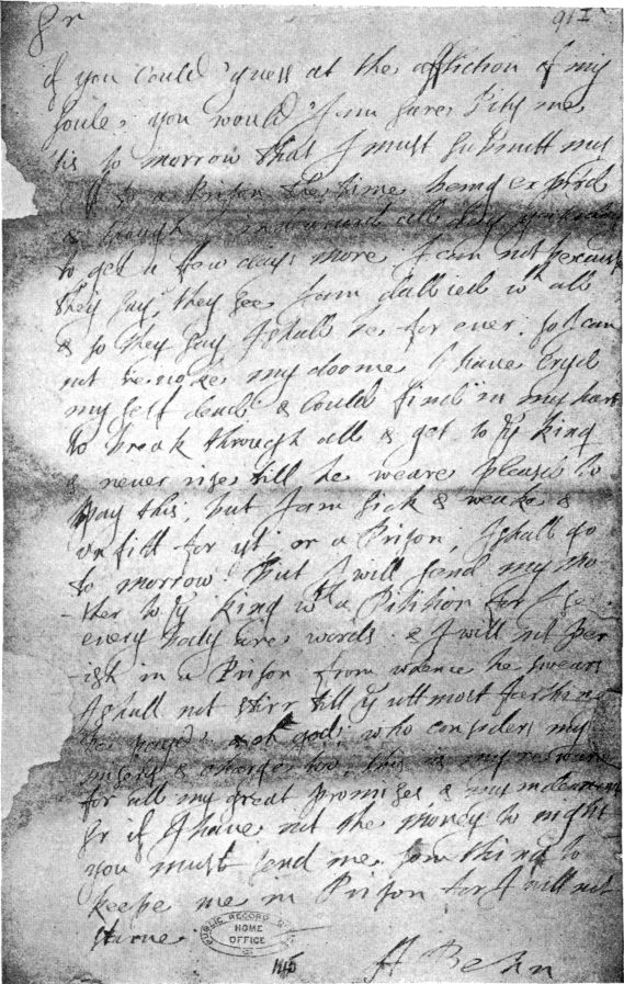 But the chapter of her troubles was by no means ended. Debt weighed like a millstone round her neck. As the weary months went by and Aphra was begging in vain for her salary, long overdue, to be paid, Butler, a harsh, dour man with heart of xxvi stone, became impatient and resorted to drastic measures, eventually flinging her into a debtor’s prison. There are extant three petitions, undated indeed, but which must be referred to the early autumn of 1668, from Mrs. Behn to Charles II. Sadly complaining of two years’ bitter sufferings, she prays for an order to Mr. May14 or Mr. Chiffinch15 to satisfy Butler, who declares he will stop at nothing if he is not paid within a week. In a second document she sets out the reasons for her urgent claim of £150. Both Mr. Halsall and Mr. Killigrew know how justly it is her due, and she is hourly threatened with an execution. To this is annexed a letter from the poor distracted woman to Killigrew, which runs as follows:—