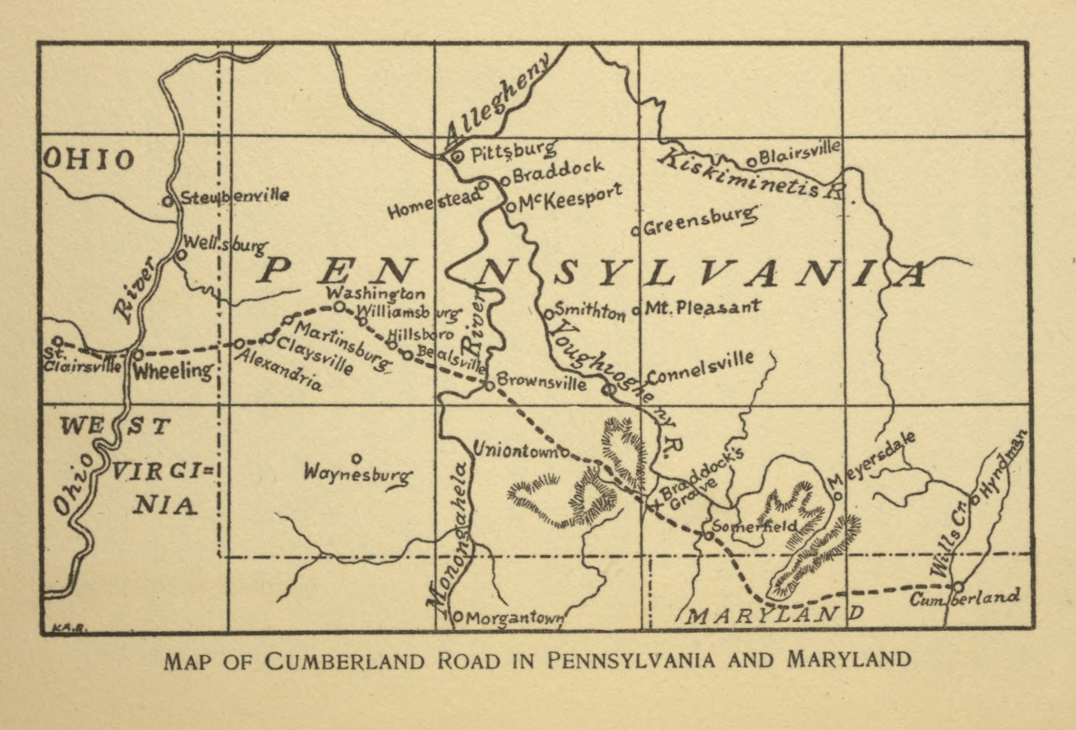 “From a stone at the corner of lot No. 1, in Cumberland, near the confluence of Will’s creek and the north branch of the Potomac river; thence extending along the street westwardly, to cross the hill lying between Cumberland and Gwynn’s, at the gap where Braddock’s road passes it; thence near Gwynn’s and Jesse Tomlinson’s, to cross the big Youghiogheny near the mouth of Roger’s run, between the crossing of Braddock’s road and the confluence of the[Pg 35] streams which form the Turkey foot; thence to cross Laurel Hill near the forks of Dunbar’s run, to the west foot of that hill, at a point near where Braddock’s old road reached it, near Gist’s old place, now Colonel Isaac Meason’s, thence through Brownsville and Bridgeport, to cross the Monongahela river below Josias Crawfords’ ferry; and thence on as straight a course as the country will admit to the Ohio, at a point between the mouth of Wheeling creek and the lower point of Wheeling island.