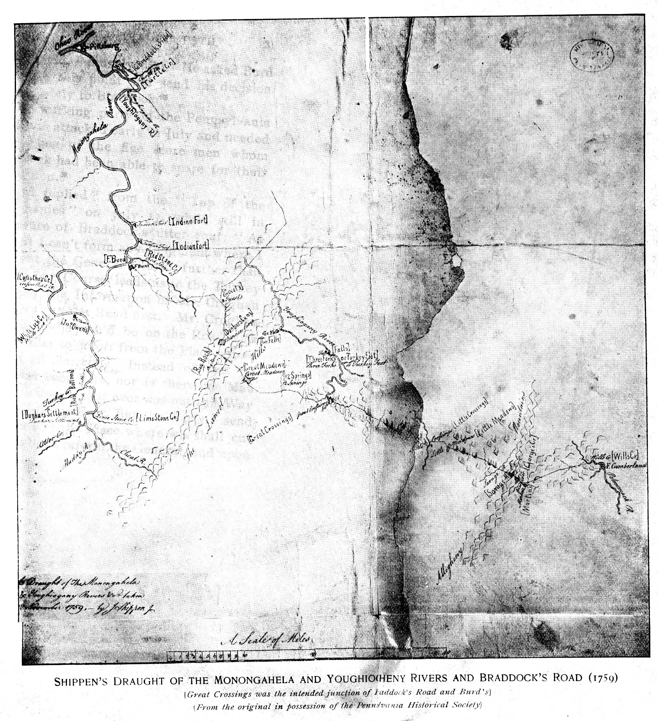 Shippen’s Draught of the Monongahela and Youghiogheny Rivers and Braddock’s Road (1759)(Great Crossings was the intended junction of Paddock’s Road and Burd’s)