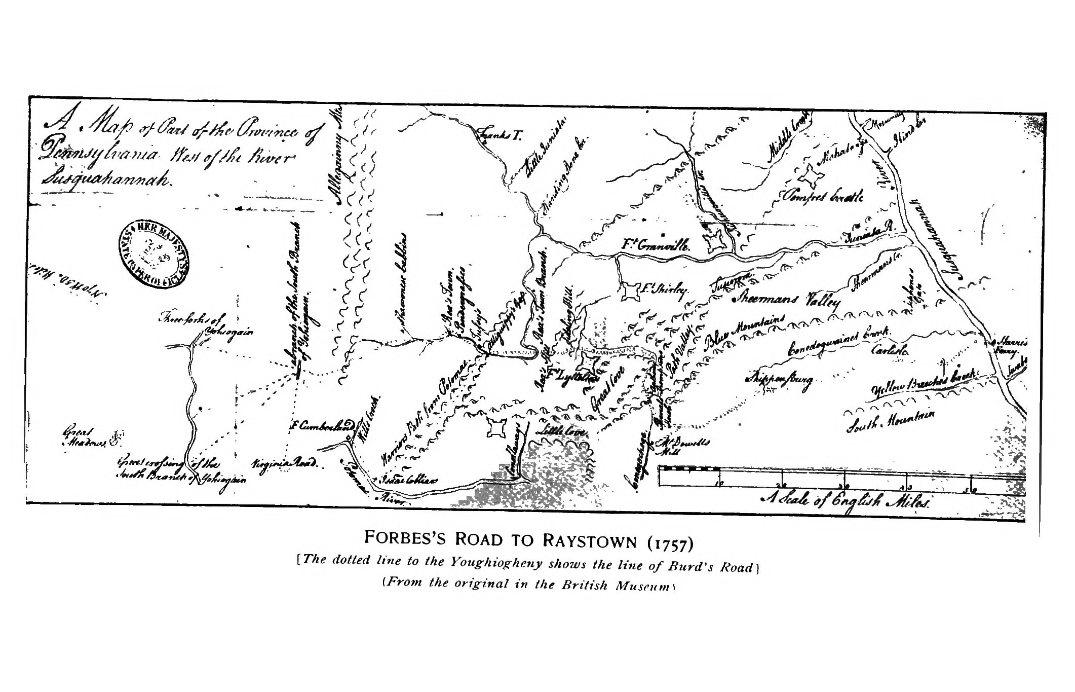 [57] The main route westward was, the year before, in poor condition between Philadelphia and Bedford. Loudon to Denny, Pennsylvania Archives, iii, pp. 278-279.