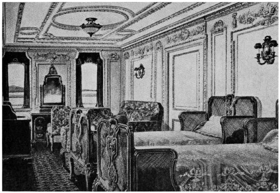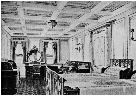MY stateroom was an outside one on Deck C on the starboard quarter, somewhat abaft amidships. It was No. C, 51. I was enjoying a good night’s rest when I was aroused by a sudden shock and noise forward on the starboard side, which I at once concluded was caused by a collision, with some other ship perhaps. I jumped from my bed, turned on the electric light, glanced at my watch nearby on the dresser, which I had changed to agree with ship’s time on the day before and which now registered twelve o’clock. Correct ship’s time would make it about 11.45. I opened the door of my cabin, looked out into the corridor, but could not see or hear anyone—there was no commotion whatever; but immediately following the collision came a great noise of escaping steam. I listened intently, but could hear no machinery. There was [Pg 15] no mistaking that something wrong had happened, because of the ship stopping and the blowing off of steam.