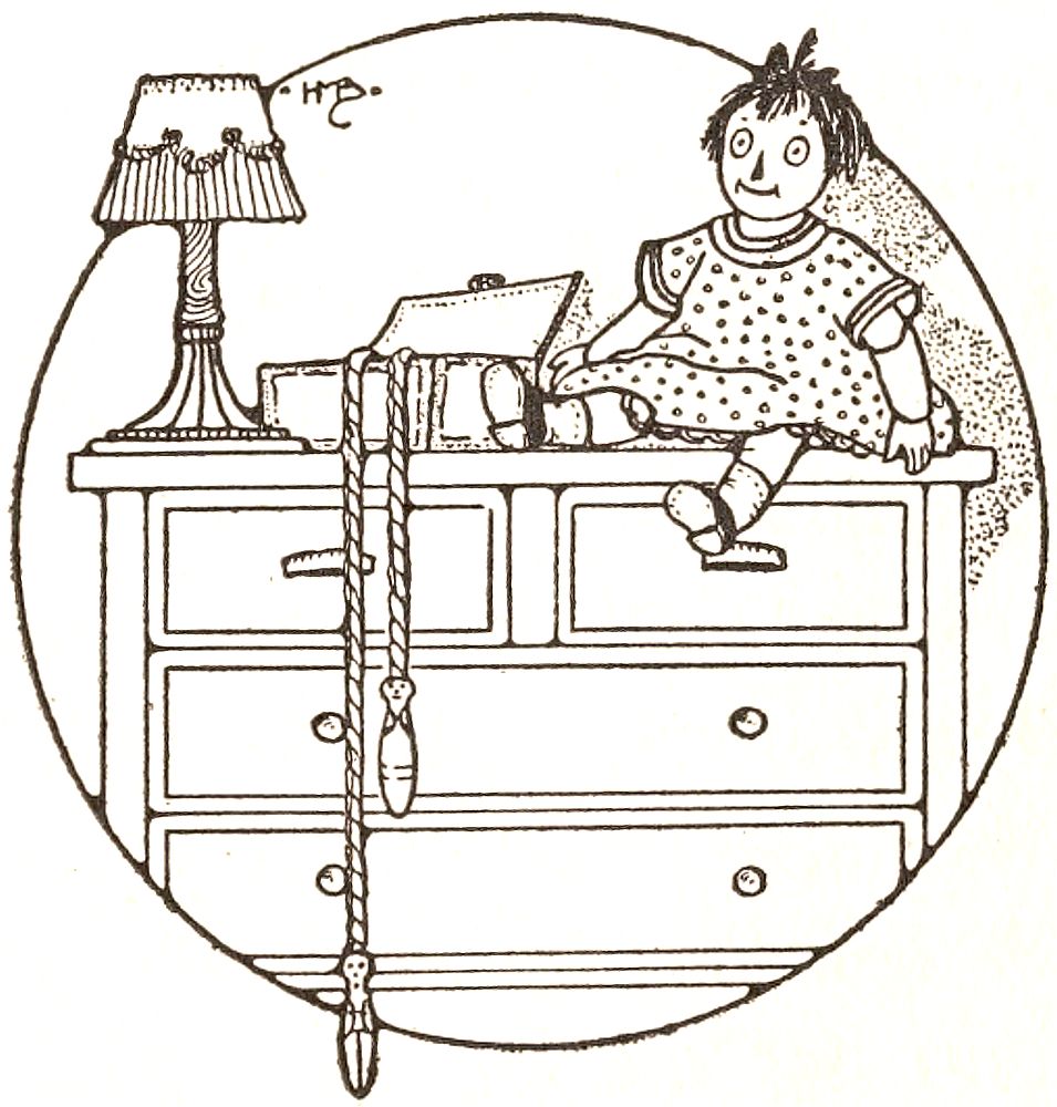 Well, one night when Peggy went to bed, she took Lady Grace and Teddy with her, and left Wooden on the top of a chest of drawers with all her clothes on. And then Wooden might have felt a little sad, because it was the first time that such a thing had ever happened to her; and she might have begun to wonder whether, after all, Peggy loved her quite as much as she had done before.
