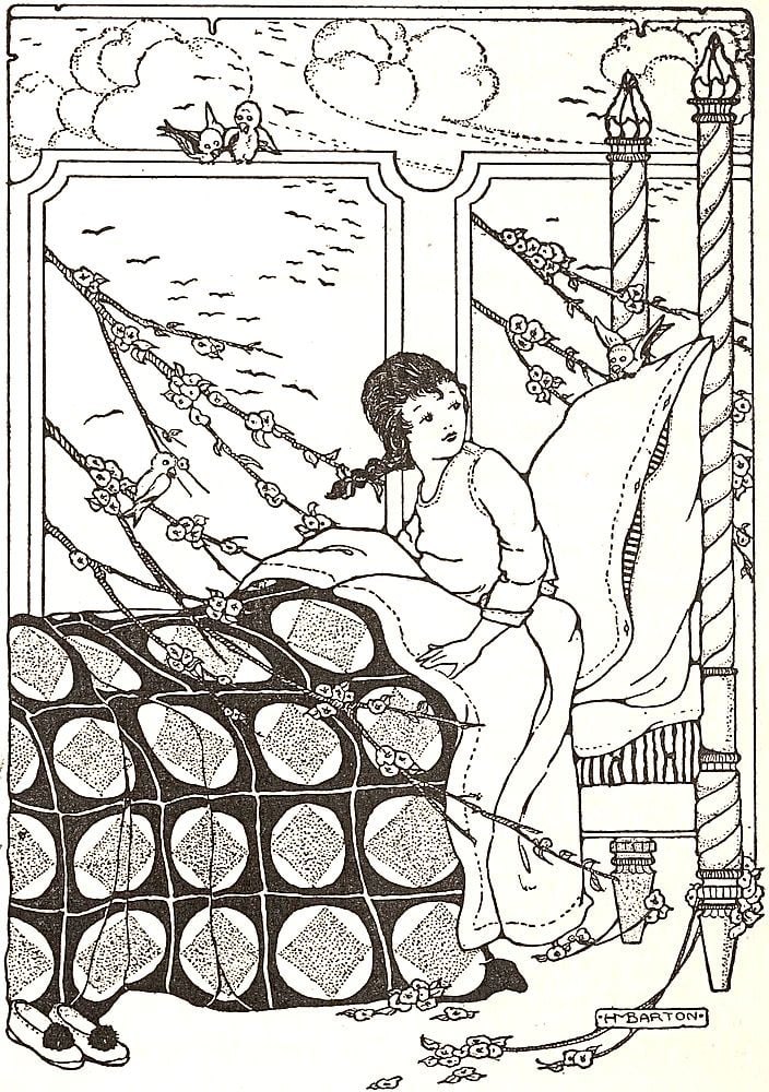 And that was not nearly all, for everything was changing all around her. The apple-blossoms on the[Pg 18] wall-paper had become real apple-blossoms, and were dancing in a bright spring breeze; the ceiling had melted away into blue sky; and suddenly the little birds that had been sitting in a long row on the bough which ran round the top of the paper flew up all together and filled the air with their singing.