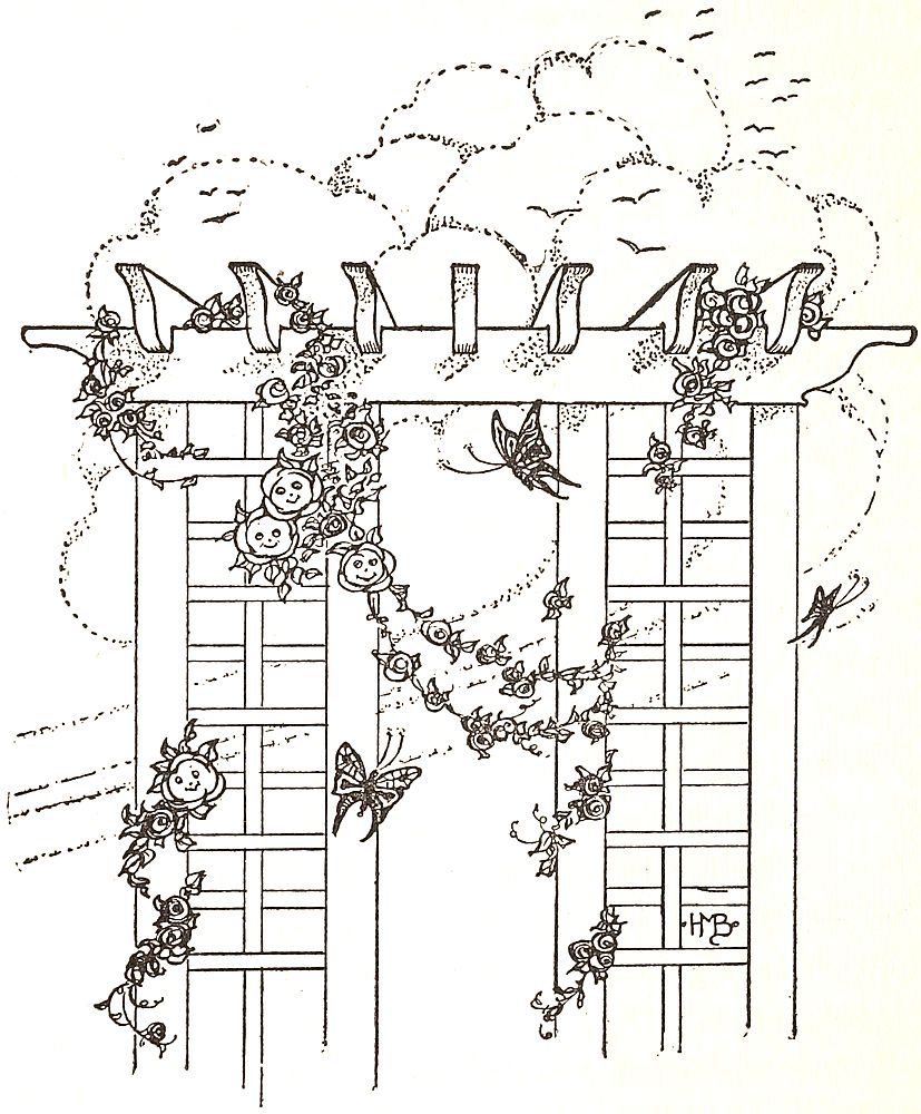 Now, although it had been winter when Peggy went to bed, and the thermometer on the pergola outside had registered two degrees of frost, it had suddenly become the most delicious spring and summer weather combined. When Peggy saw the garden she clapped her hands with delight. Never was seen such a blaze of colour. Everything was out at once—all the trees, and all the shrubs, and all the flowers. The house was smothered in roses and honeysuckle and clematis. The[Pg 22] daffodils were dancing in the grass. The rhododendrons and azaleas flamed against the green of the darker shrubs. Every flower in the long border was in full bloom, from the scarlet anemones of the early spring to the yellow sunflowers and Michaelmas daisies of the late autumn; and so were the lilacs, white and purple, the guelder roses, the syringas, the may-trees and laburnums, the pink almond, and the Pyrus Malus Floribunda, which was Peggy’s favourite tree, though she never quite got its name right. There were thousands of blooms in the rose garden; the climbing roses trained over the pergola were as gay as gay could be; and even the newly-planted nut-walk had grown twelve feet in a few hours, and made a shady green tunnel through which you could see the park beyond.