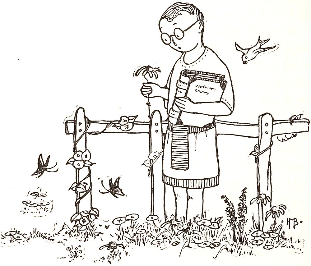 The moment her feet had touched the floor, lo and behold! she was fully dressed, in a clean blue over-all, with her outdoor shoes and her big straw hat trimmed with daisies. Her face and hands were washed, her nails scrubbed, and her teeth cleaned; and her long[Pg 19] hair, which was always plaited for the night, was brushed and tied up with her blue ribbon.