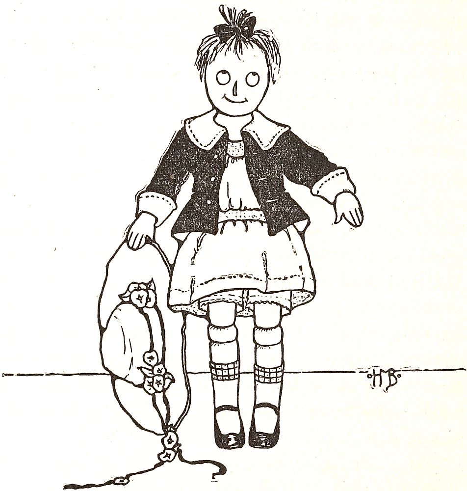 Wooden had all the clothes of Peggy’s dolls’ wardrobe to wear, if they fitted her, and was better dressed than most dolls. And as everybody liked her when they once came to know her, she had plenty of things given her as time went on. When Miss Clay came to the house for a week or two to sew, she would generally make something for Wooden out of the material left over. Once she made her a purple velvet jacket, and once a tailor-made skirt. As for nightgowns, and petticoats, and things like that, trimmed with lace, and sometimes with pink and blue ribbon, Wooden was so well supplied that Peggy’s father said her laundry bill was becoming quite a serious item. So it will be seen that Wooden was very much better off than when she had belonged to Mabel, and had only had one red flannel dress.