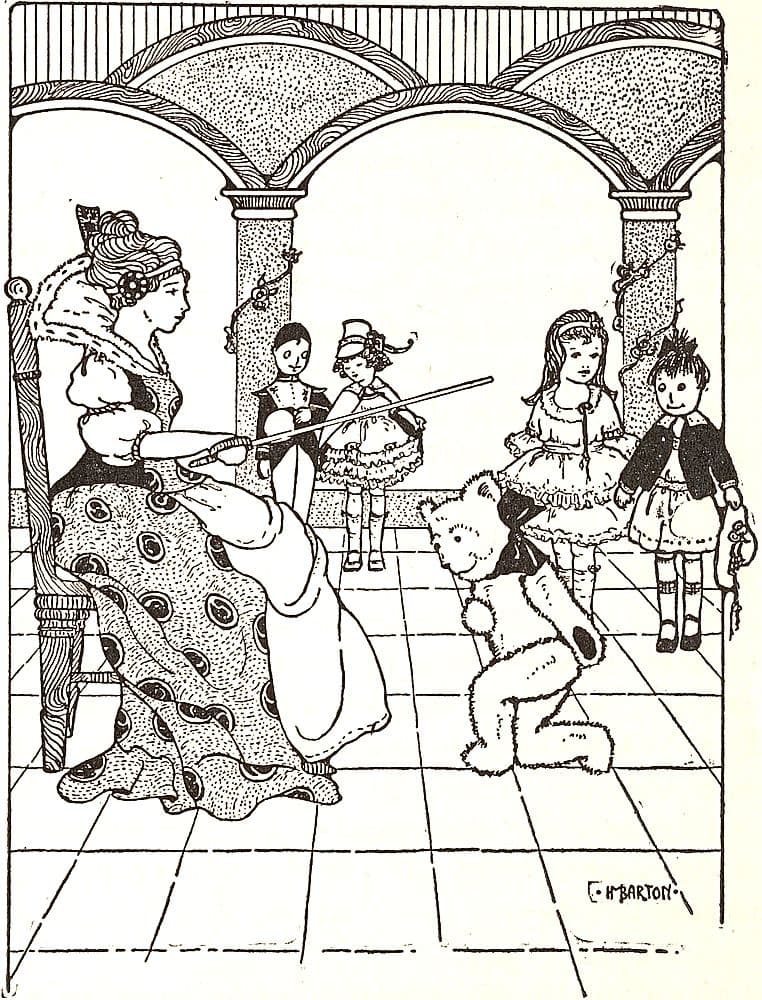 The Queen then called for a sword. Colonel Jim handed her his, and to his great surprise she knighted him with it, and then conferred the same honour upon Teddy, who was even more surprised, as he was the first bear in Toyland who had ever received it.